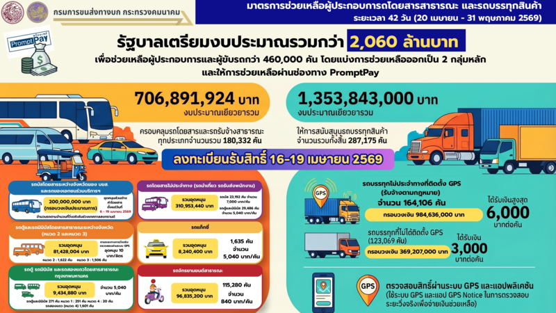 อธิบดีกรมการขนส่งทางบก กล่าวอีกว่า สำหรับกลุ่มผู้ประกอบการขนส่งและผู้ขับรถที่เข้าข่ายได้รับการช่วยเหลือ กรมการขนส่งทางบก จะเปิดให้ลงทะเบียนรับสิทธิ์ระหว่างวันที่ 16-19 เม.ย.2569 โดยจะจ่ายเงินช่วยเหลือผ่านระบบ PromptPay เพื่อช่วยเหลือผู้ประกอบการขนส่ง ในการเดินรถตลอดระยะเวลา 42 วัน (20 เม.ย.-31 พ.ค.2569)