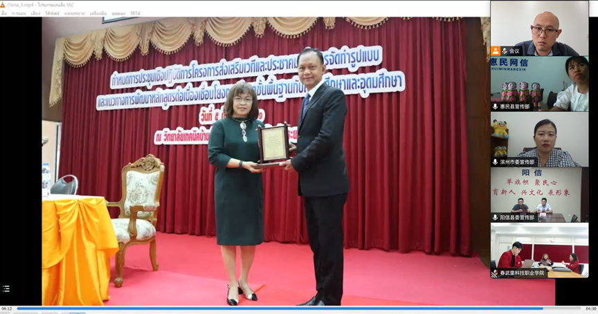 ในการประชุมท่าน เฉิน ลุ้ย ผู้อำนวยการสำนักงานฝ่ายโฆษณาของมณฑลหยางซินและ หลู่ ชูปิน จากคณะกรรมการพรรคฝ่ายโฆษณาของมณฑลฮุ่ยหมินได้แนะนำมรดกที่จับต้องไม่ได้ที่เป็นเอกลักษณ์และผลิตภัณฑ์ที่เกี่ยวข้องของทั้งสองมณฑล หลังจากนั้นมณฑลหนางซินจัดแสดงงานฝีมือแบบดั้งเดิม เช่น งานแกะสลักที่ทำจากกระดูกวัว งานหัตถกรรมเหล่านี้รังสรรค์ด้วยความอุตสาหะและภูมิปัญญาของช่างฝีมือในท้องถิ่น ในเวลาเดียวกัน มณฑลฮุ่ยหมินวาดภาพที่เป็นเอกลักษณ์ของประเพณีท้องถิ่นด้วยประติมากรรมดินเผาที่มีลักษณะเฉพาะของท้องถิ่นต่อมาวิทยาลัยอาชีวศึกษาเทคนิคชลบุรีได้เปิดวิดีโอประชาสัมพันธ์ของโรงเรียน แสดงให้เห็นถึงความสำเร็จและการพัฒนาการศึกษาด้านวิทยาศาสตร์และเทคโนโลยีของโรงเรียน หลังจากนั้น อาจารย์หลี่ ฮวา ได้แนะนำโรงเรียนอย่างละเอียด โดยเน้นย้ำผลงานที่โดดเด่นของมหาวิทยาลัยสาขาวิทยาศาสตร์และเทคโนโลยีอาชีวศึกษาชลบุรีในด้านวัตกรรมเทคโนโลยีและการศึกษา นอกจากนี้ ทางโรงเรียนยังแสดงความคาดหวังสำหรับความร่วมมือในอนาคตระหว่างจีน-ไทยในด้านการศึกษาด้านวิทยาศาสตร์ ด้านเทคโนโลยี และด้านอื่นๆ