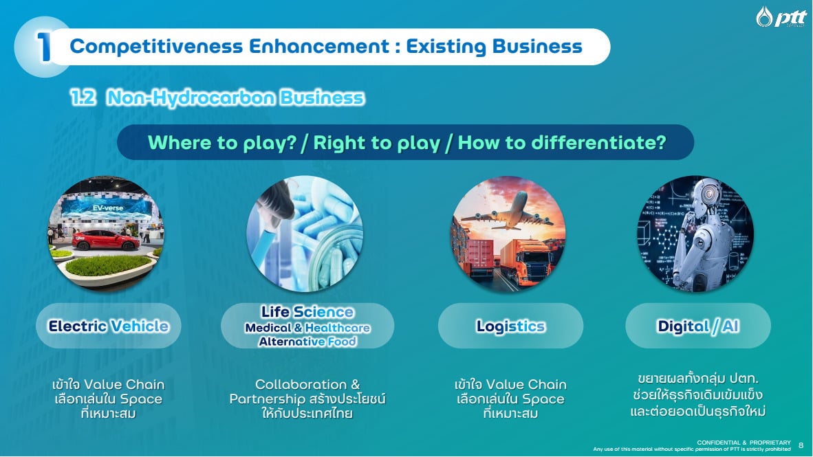 กลุ่มธุรกิจ Non-Hydrocarbon Business ที่เป็น New S-Curve หรือธุรกิจใหม่ มีหลักในการดำเนินธุรกิจ ดังนี้