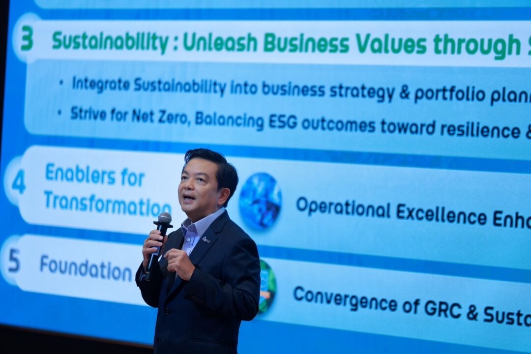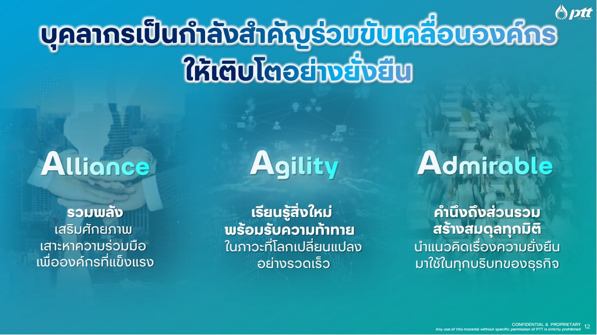 4. สร้างปัจจัยที่ทำให้เกิดการขับเคลื่อนอย่างเป็นรูปธรรม (Enablers for Transformation) ได้แก่ สร้างประสิทธิภาพการดำเนินงานที่เป็นเลิศ (Operational Excelence) เพื่อพัฒนาขีดความสามารถ เนื่องจากมีปัจจัยภายนอกต่างๆ ที่มีผลกระทบต่อธุรกิจ จึงควรมุ่งเน้นทำสิ่งที่ควบคุมได้อย่างเข้มข้น ต้องสร้างความแข็งแกร่งจากภายใน (Build core resilience) ลดต้นทุน โดยการยกระดับ Operation & Efficiency ด้วยการนำเทคโนโลยี ดิจิทัล และ AI มาประยุกต์ใช้ โดยมีแผนงานและเป้าหมายที่ชัดเจน และขยายผลทั่วทั้งกลุ่ม ปตท. อีกทั้ง ต้องทำ Lean Organization ร่วมกับ Digital Transformation ซึ่งต้องเริ่มในวันที่องค์กรยังแข็งแรง จัดลำดับความสำคัญ เริ่มทำโครงการที่เห็นผลลัพธ์เร็ว เพื่อให้เกิดการยอมรับในทุกระดับ และต้องสร้างความเข้มแข็งด้าน Culture สร้างความตระหนัก ปลูกฝังให้พนักงานกล้าที่จะปรับและพร้อมที่จะเปลี่ยนเพื่อการเติบโตอย่างยั่งยืน