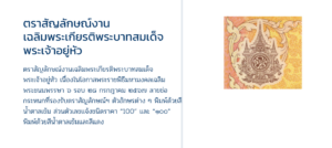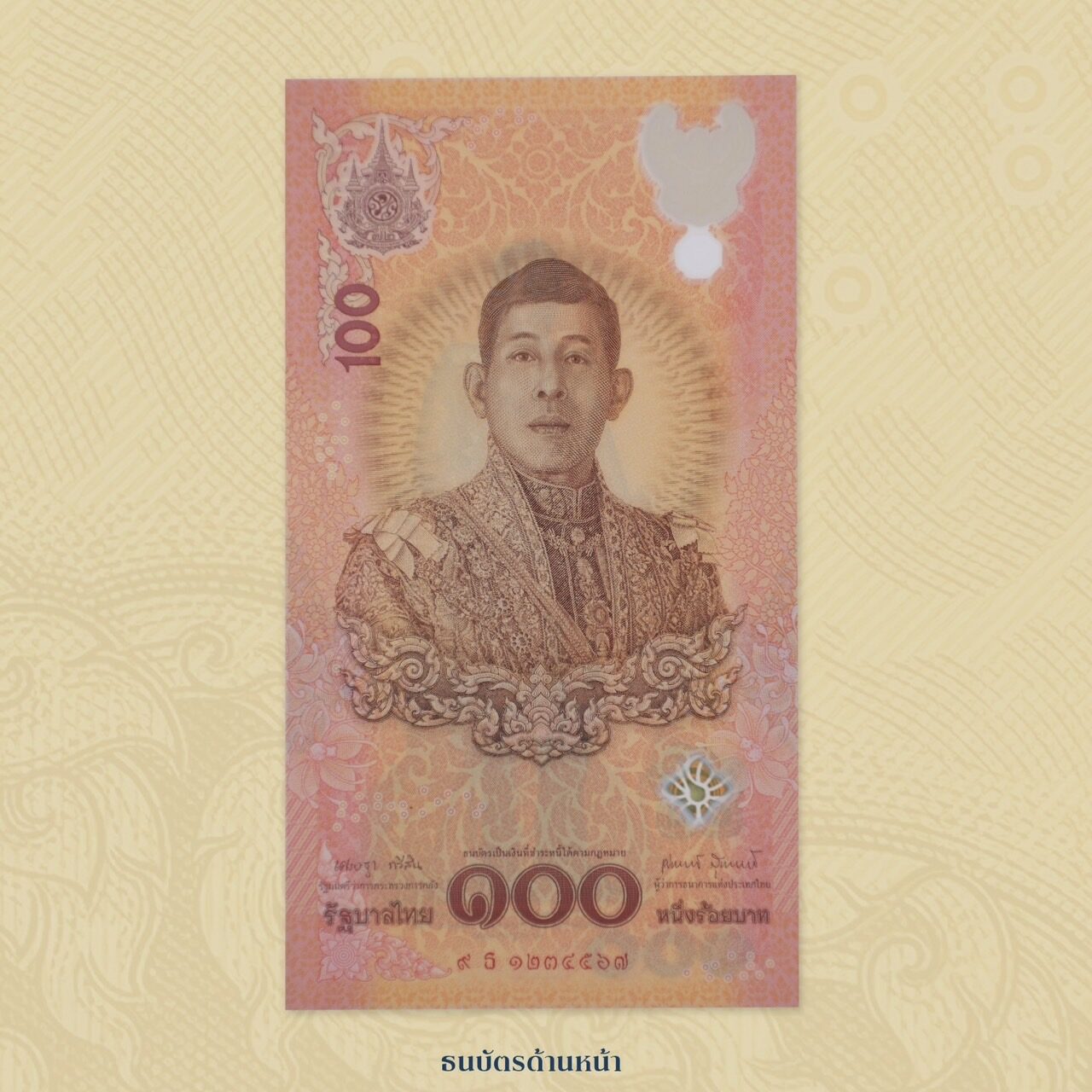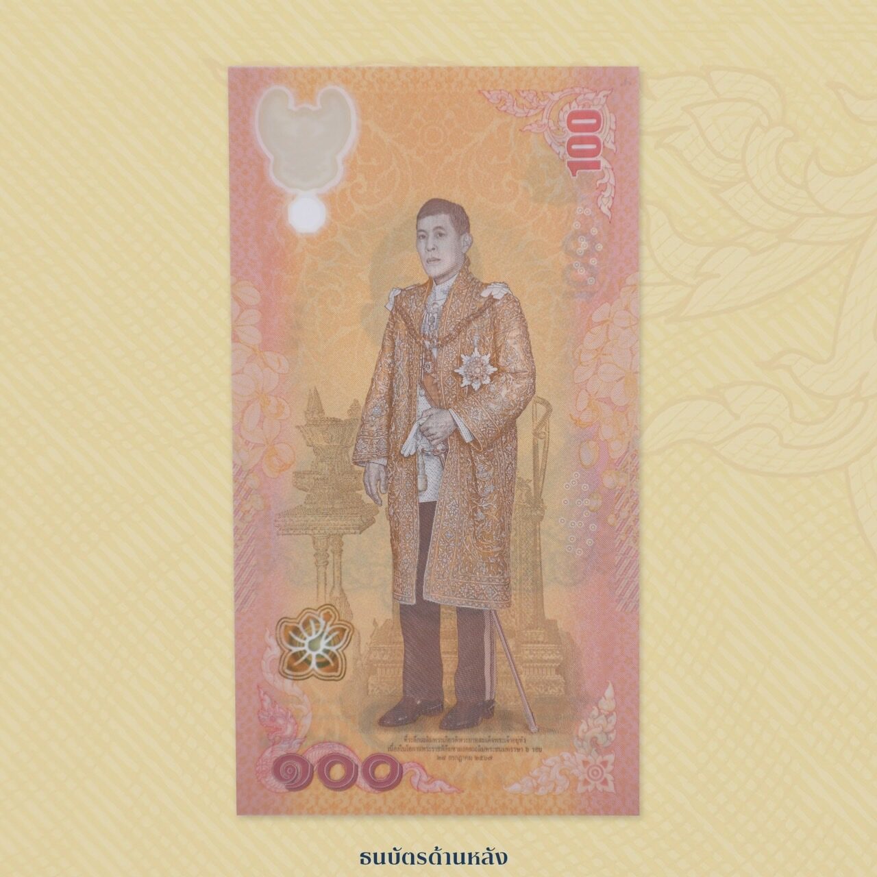 ตราสัญลักษณ์งานเฉลิมพระเกียรติพระบาทสมเด็จพระเจ้าอยู่หัว เนื่องในโอกาสพระราชพิธีมหามงคลเฉลิมพระชนมพรรษา ๖ รอบ ๒๘ กรกฎาคม ๒๕๖๗ ลายช่อกระหนกที่รองรับตราสัญลักษณ์ฯ ตัวอักษรต่าง ๆ พิมพ์ด้วยสีน้ำตาลเข้ม ส่วนตัวเลขแจ้งชนิดราคา “100” และ “๑๐๐” พิมพ์ด้วยสีน้ำตาลเข้มและสีแดงช่องใสรูปพระครุฑพ่าห์ หมึกพิเศษสีทองภายในช่องใส