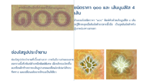 ตัวเลขแจ้งชนิดราคา “๑๐๐” พิมพ์ทับด้วยเส้นนูนสีใส 4 เส้น จะรู้สึกสะดุดเมื่อสัมผัสด้วยปลายนิ้วมือ เป็นจุดสัมผัสสำหรับผู้บกพร่องทางสายตาช่องใสรูปประจำยาม