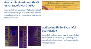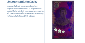 บริเวณเบื้องล่างของพระบรมสาทิสลักษณ์จะปรากฏภาพดอกรวงผึ้งและลายดาวสีเขียวอมเหลืองเรืองแสงภายใต้รังสีเหนือม่วงหมวดอักษรเลขหมาย เรืองแสงสีส้ม