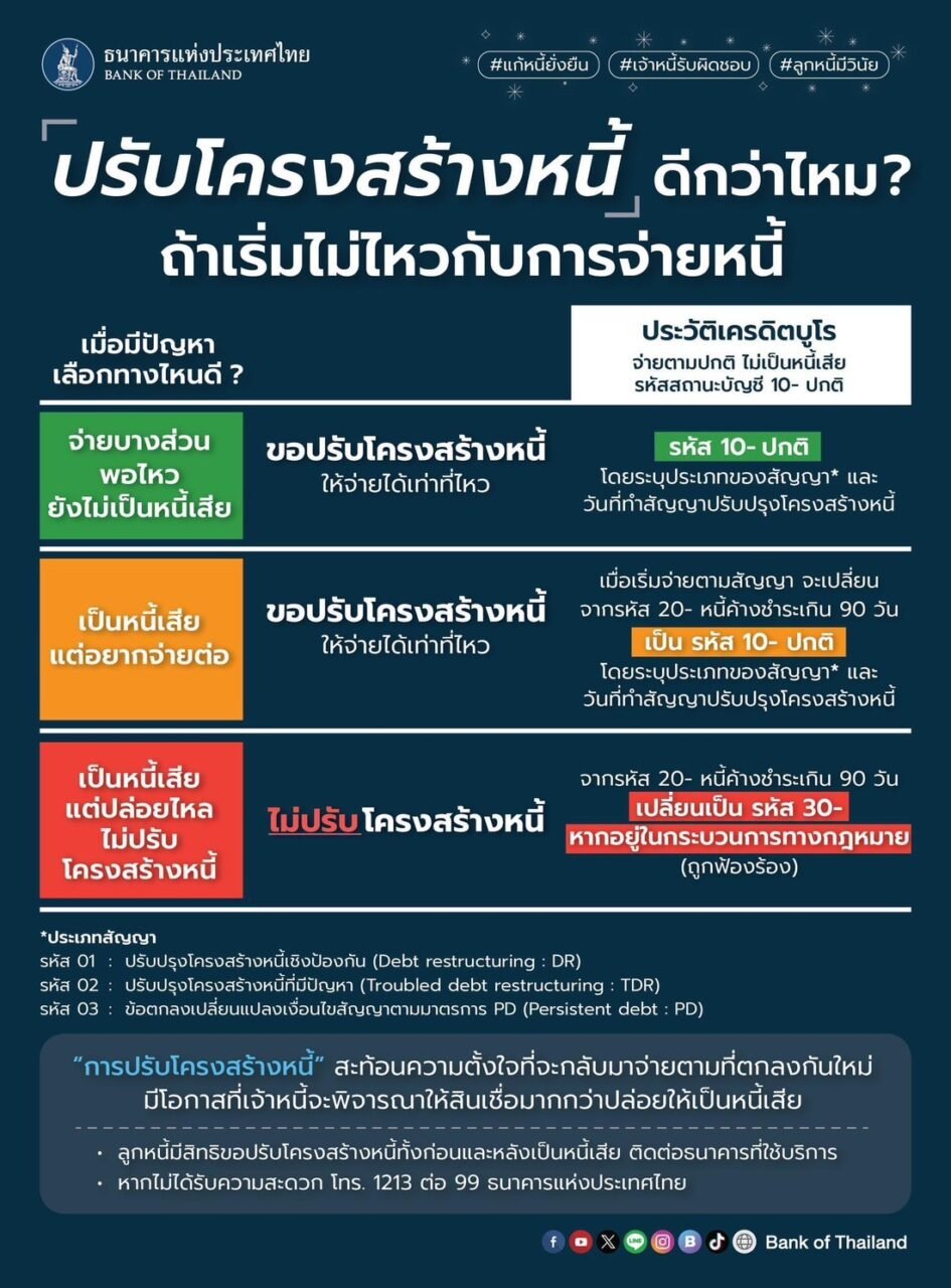 ข้อควรรู้ : ลูกหนี้มีสิทธิขอปรับโครงสร้างหนี้ทั้งก่อนและหลังเป็นหนี้เสีย สามารถติดต่อธนาคารที่ใช้บริการได้เลย แต่หากไม่ได้รับความสะดวก ติดต่อแบงก์ชาติ โทร. 1213 กด 99 ธนาคารแห่งประเทศไทย