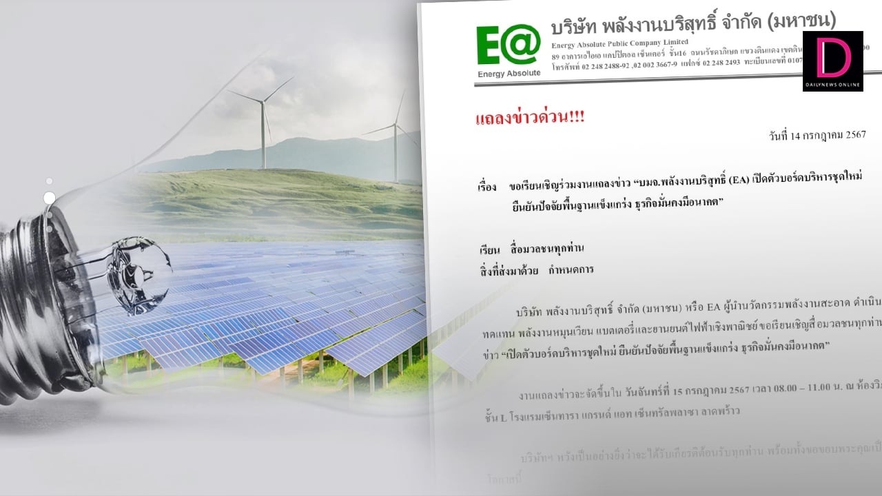 รายงานข่าวจาก บริษัท พลังงานบริสุทธิ์ จำกัด (มหาชน) EAเปิดเผยว่า ขอเรียนเชิญสื่อมวลชน ร่วมงานแถลงข่าว “บมจ.พลังงานบริสุทธิ์ (EA) เปิดตัวบอร์ดบริหารชุดใหม่ ยืนยันปัจจัยพื้นฐานแข็งแกร่ง ธุรกิจมั่นคงมีอนาคต”