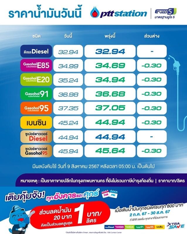 เมื่อวันที่ 9 ส.ค. ผู้สื่อข่าวรายงานว่า สถานีบริการน้ำมันพีทีที สเตชั่น ประกาศ ปรับราคาขายปลีก น้ำมันเบนซิน แก๊สโซฮอล์ทุกชนิดลง 30 สตางค์ต่อลิตร มีหลังเวลา 05.00 น. ของวันเดียวกันนี้ เป็นต้นไป ส่งผลให้ น้ำมันเบนซินอยู่ที่ 44.94 บาทต่อลิตร แก๊สโซฮอล์ 95 อยู่ที่ 37.05 บาทต่อลิตร แก๊สโซฮอล์ 91 อยู่ที่ 36.68 บาทต่อลิตร E20 อยู่ที่ 34.94,บาทต่อลิตร E85 อยู่ที่ 34.69 บาทต่อลิตร และพรีเมียม แก๊สโซฮอล์ 95 อยู่ที่ 45.64 บาทต่อลิตร