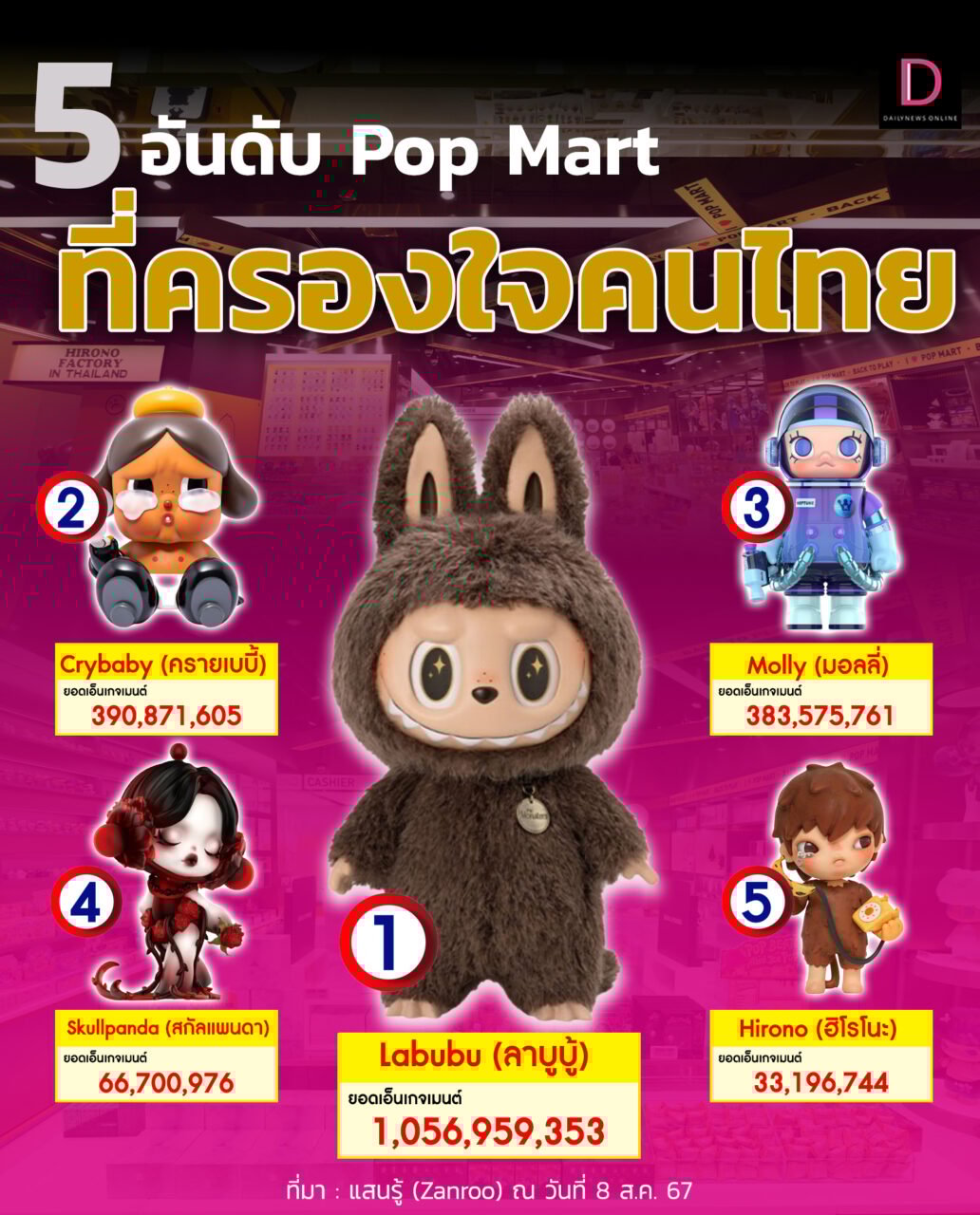 ขณะที่เมื่อมาดูว่า คนไทยนิยมคาแรกเตอร์ Popmart ตัวไหนมากที่สุดนั้น พบว่า 5 อันดับสุดฮิต! ของคนไทย มีดังนี้ คือ