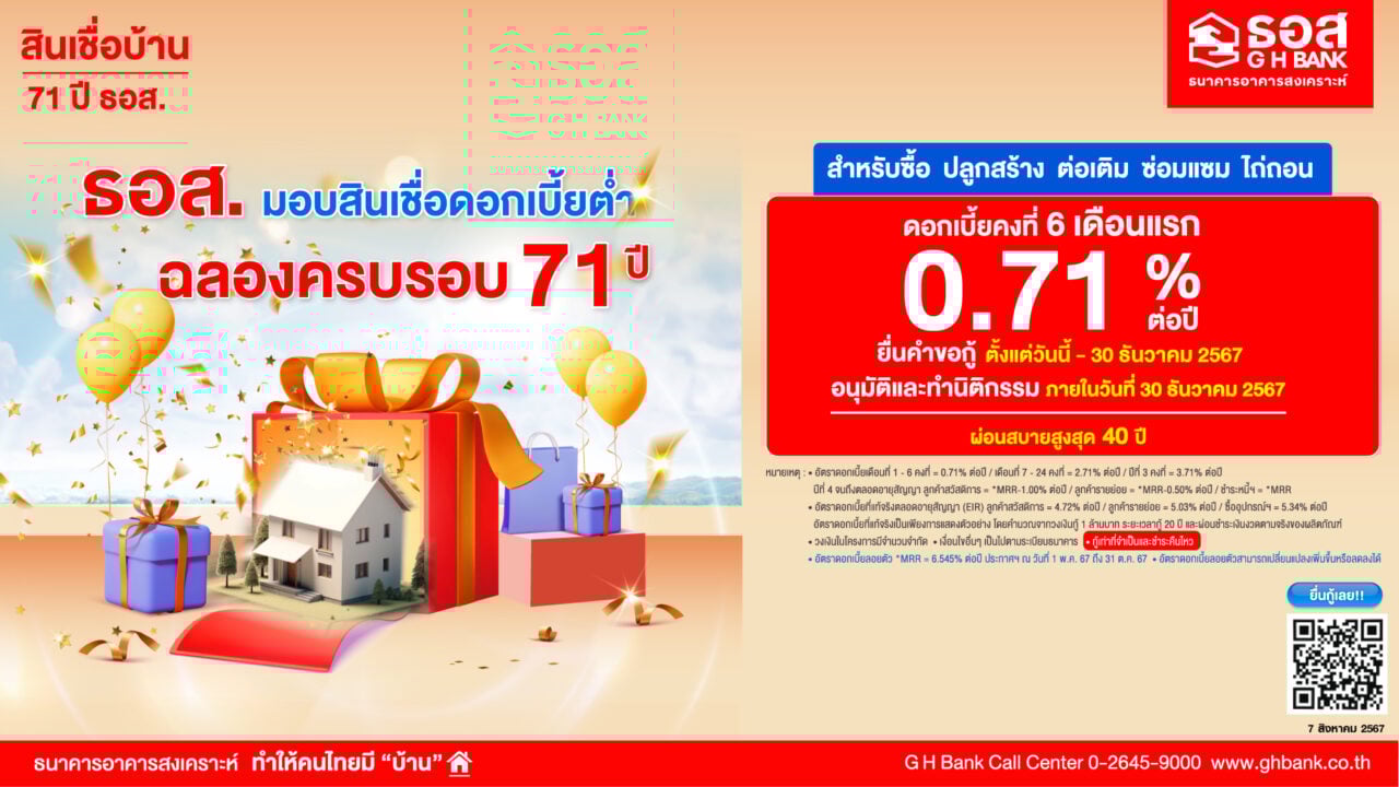 เป็นโอกาสทองสำหรับคนอยากมีบ้าน ในช่วงเศรษฐกิจกำลังขึ้นๆ ลงๆ แบบนี้ เมื่อล่าสุด ธนาคารอาคารสงเคราะห์ (ธอส.) ฉลองวันสถาปนาครบรอบ 71 ปี ตอบแทนลูกค้าด้วยการมอบโปรโมชั่นสินเชื่อบ้านอัตราดอกเบี้ยต่ำ กรอบวงเงินรวม 50,000 ล้านบาท กับ “สินเชื่อบ้าน 71 ปี ธอส.”