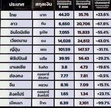จากตารางนี้ ในช่วง 24 ปีที่ผ่านมา ค่าเงินบาทแข็งมากเกินไปจริงๆ กว่า 50-60% เมื่อเทียบกับเพื่อนบ้าน วันนี้เงินบาทแข็งกว่าค่าเงินจีน,ฮ่องกง,สหรัฐฯ หากไม่แก้ไข ประเทศจะเติบโตยาก ประชาชนจะยากจนทั้งประเทศ และประชาชนจะเป็นหนี้สินเพิ่มขึ้นมากมาย ราคาน้ำมันและสินค้านำเข้าอาจถูกลงหน่อย แต่ไม่มีปัญญาซื้อ