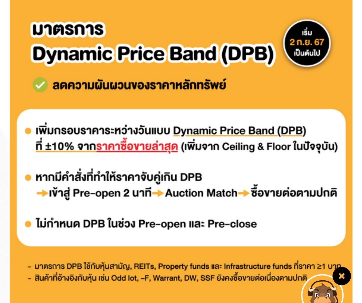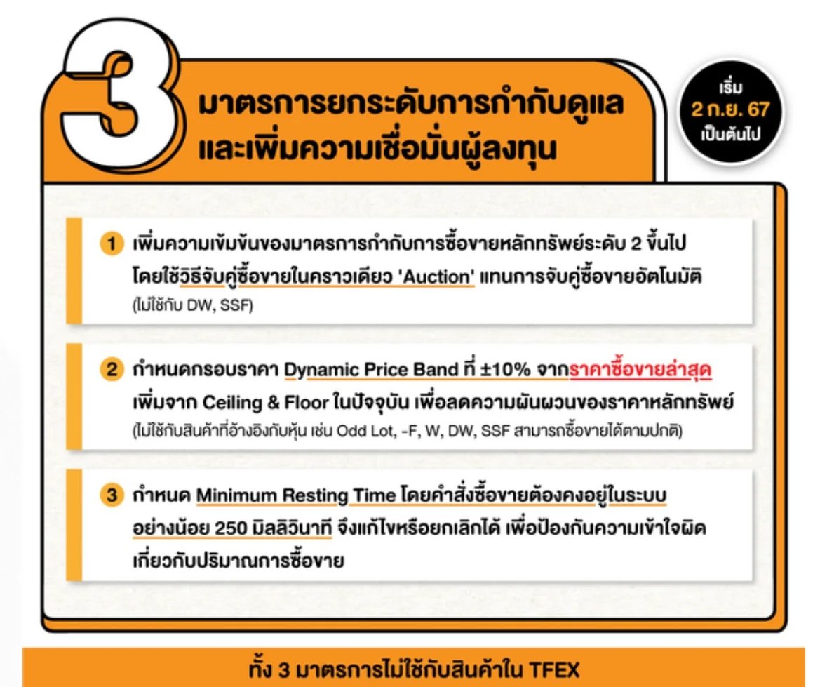 • กำหนดกรอบราคาซื้อขายแบบ Dynamic Price Band เป็นรายหลักทรัพย์(±10% จากราคาซื้อขายล่าสุดของหลักทรัพย์นั้น)เพิ่มเติมจาก Ceiling & Floor ในปัจจุบัน (±30% จากราคาปิดในวันทำการก่อนหน้า)เพื่อเพิ่มกลไกในการควบคุมความผันผวนของราคาซื้อขายหลักทรัพย์