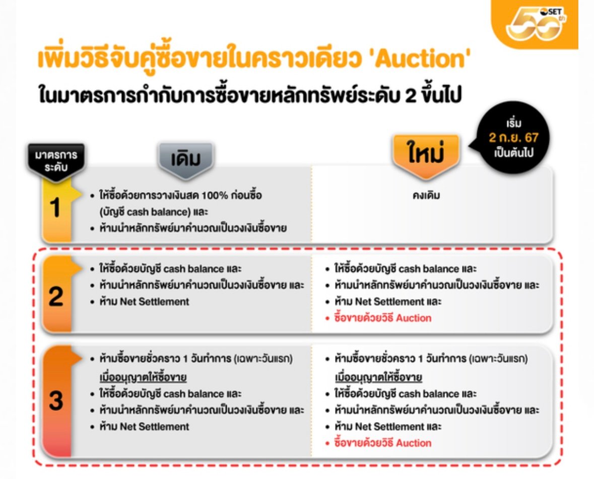 • เพิ่มความเข้มข้นของมาตรการกำกับการซื้อขายหลักทรัพย์ที่มีการซื้อขายผิดไปจากสภาพปกติ (“มาตรการฯ”)จากมาตรการฯ ที่มีอยู่ในปัจจุบัน โดยเพิ่มวิธีจับคู่ซื้อขายในคราวเดียว (Auction) ตามช่วงเวลาที่ตลาดหลักทรัพย์ฯ กำหนด สำหรับหลักทรัพย์ที่มีการซื้อขายผิดไปจากสภาพปกติ และตลาดหลักทรัพย์ฯ กำหนดให้เข้ามาตรการฯ ตั้งแต่ระดับ 2 ขึ้นไป