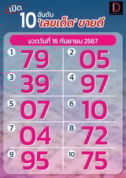 เมื่อจัดลำดับความนิยมของเลขดัง 10 อันดับ พบมีดังนี้ อันดับ 1 เลข 79 อันดับ 2 เลข 05 อันดับ 3 เลข 39 อันดับ 4 เลข 97 อันดับ 5 เลข 07 อันดับ 6 เลข 10 อันดับ 7 เลข 04 อันดับ 8 เลข 72 อันดับ 9 เลข 95 และอันดับ 10 เลข 75