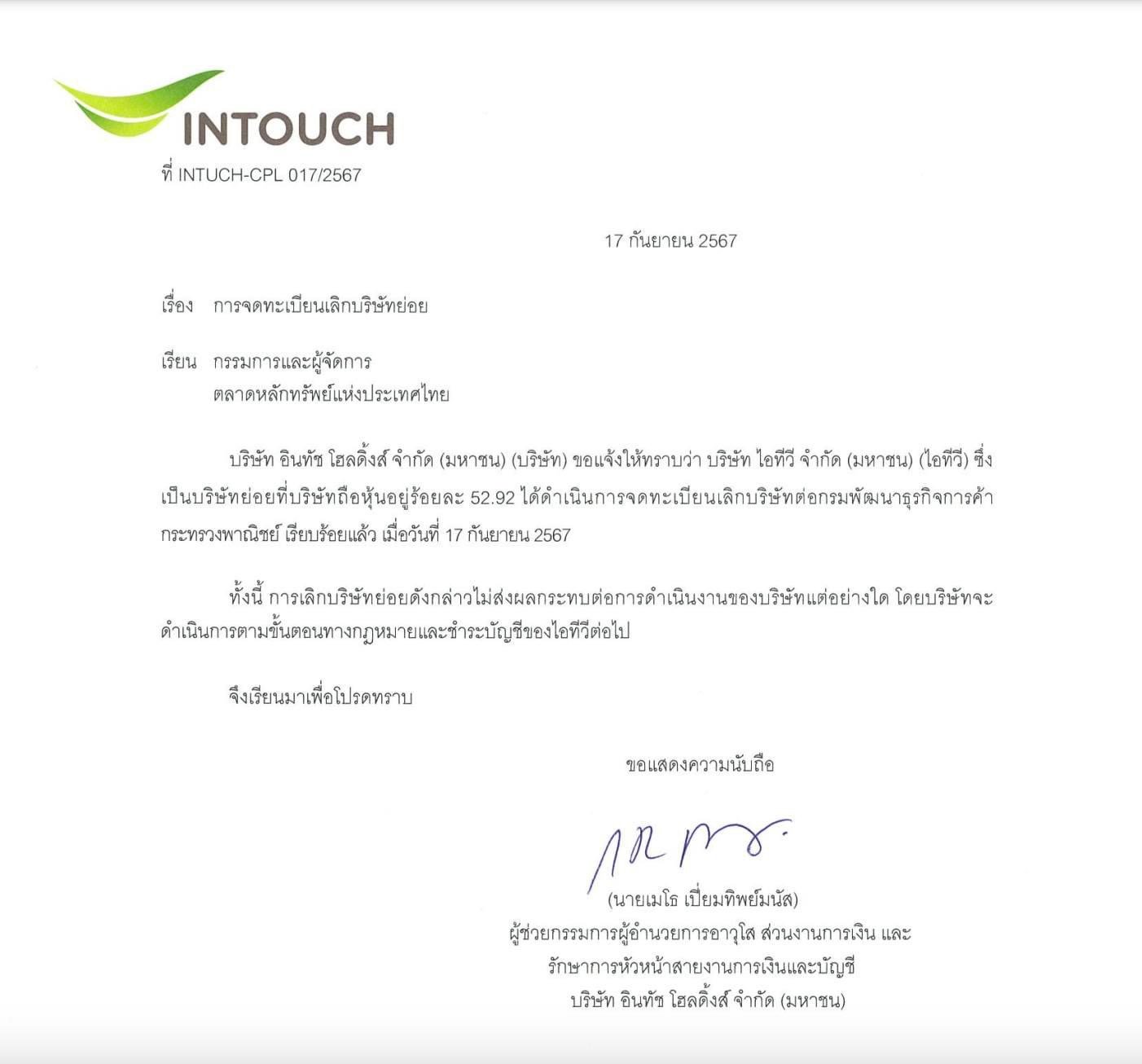 อินทัช แจ้ง จดเลิกบริษัท ‘ไอทีวี’ ชี้ไม่กระทบธุรกิจ มีผลตั้งแต่ 17 ก.ย.67