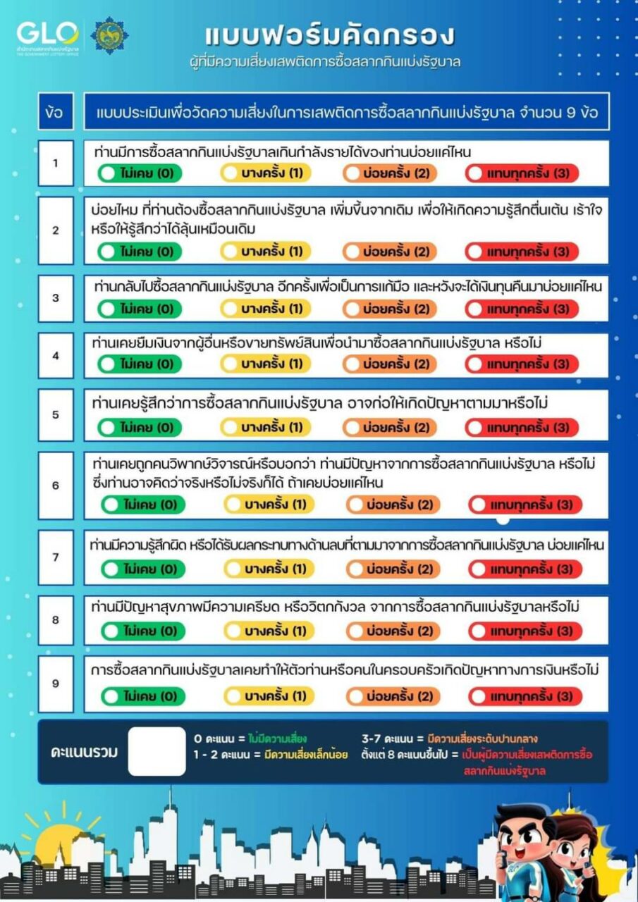 สำนักงานสลากกินแบ่งรัฐบาล หรือ GLO มีความห่วงใยต่อสังคม จัดทำแบบฟอร์มประเมินเพื่อวัดความเสี่ยงในการเสพติดการซื้อสลากกินแบ่งรัฐบาล พร้อมรับคำแนะนำการซื้ออย่างเหมาะสม
