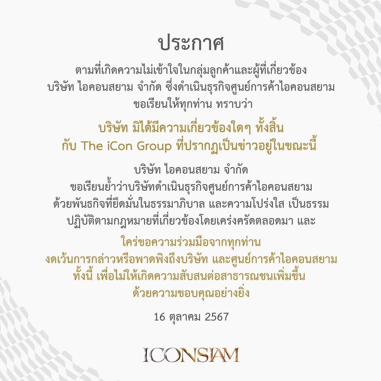 ‘ไอคอนสยาม’ ออกแถลงการณ์ ไม่เกี่ยวข้อง ‘ดิ ไอคอนกรุ๊ป’ ลูกค้าอย่าเข้าใจผิด