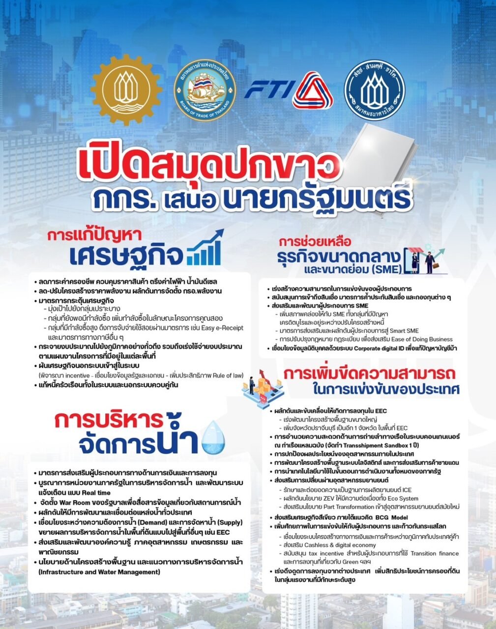 โดยมีประเด็นข้อเสนอเป็น 4 ด้านสำคัญ ได้แก่ 1.การแก้ปัญหาเศรษฐกิจ 2. การช่วยเหลือธุรกิจขนาดกลางและขนาดย่อม (SMEs) 3. การบริหารจัดการน้ำ และ 4.การเพิ่มขีดความสามารถในการแข่งขันของประเทศ