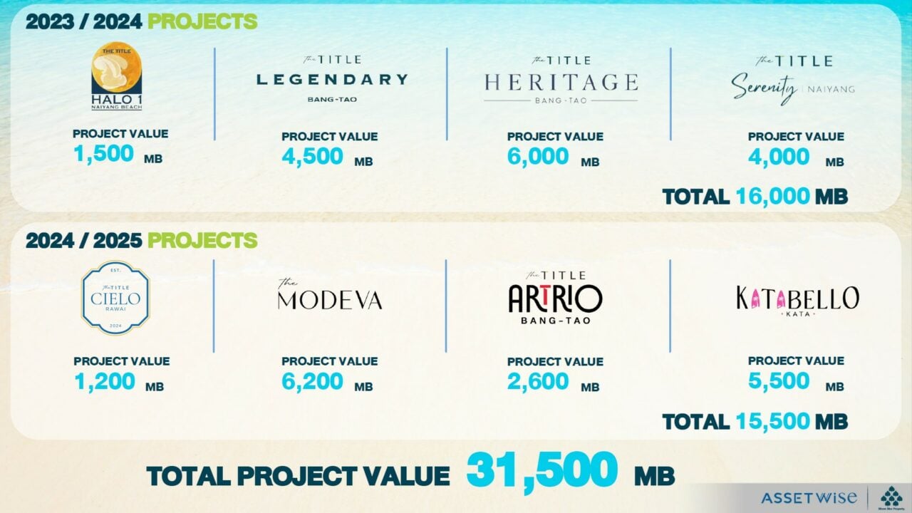 จากความสำเร็จดังกล่าวและการตอบรับที่ดีจากลูกค้า ล่าสุด ASW ได้ปรับแผนเปิดตัวโครงการ Leisure Residences ในภูเก็ต โดยเปิดโครงการใหม่รวม 4 โครงการซึ่งมากกว่าแผนที่วางไว้ มูลค่าโครงการทั้งหมด 15,500 ล้านบาท ได้แก่ 1.เดอะ ไทเทิล เชียโล่ ราไวย์ (THE TITLE CIELO RAWAI) มูลค่า 1,200 ล้านบาท ซึ่งได้รับการตอบรับอย่างดีเยี่ยมจนมียอดขายถึง 90% หลังเปิดขายได้เพียง 1 สัปดาห์ 2.เดอะ โมเดวา (THE MODEVA) มูลค่า 6,200 ล้านบาท 3.เดอะ ไทเทิล อาร์ทริโอ บางเทา (THE TITLE ARTRIO BANG-TAO) มูลค่า 2,600 ล้านบาท เตรียมเปิดขายในเดือนตุลาคมนี้ และ 4.คาตาเบลโล (KATABELLO) ในกะตะ มูลค่า 5,500 ล้านบาท มีแผนเปิดขายอย่างเป็นทางการในช่วงต้นปี 2568 ซึ่งบริษัทเชื่อมั่นว่าการปรับแผนดังกล่าวจะช่วยผลักดันยอดขายของโครงการในภูเก็ตช่วงไฮซีซันนี้ให้เพิ่มขึ้นอีก 5,000 ล้านบาท ทั้งนี้ ปัจจุบัน ASW และ TITLE มีคอนโดมิเนียมที่พัฒนาร่วมกันทั้งสิ้น 8 โครงการ มูลค่ารวม 31,500 ล้านบาท