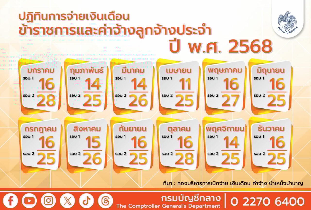 กรมบัญชีกลาง เปิดปฏิทินการจ่ายเงินเดือนข้าราชการ และค่าจ้างลูกจ้างประจำ ประจำปี 2568 ได้เมื่อไรเช็กเลย