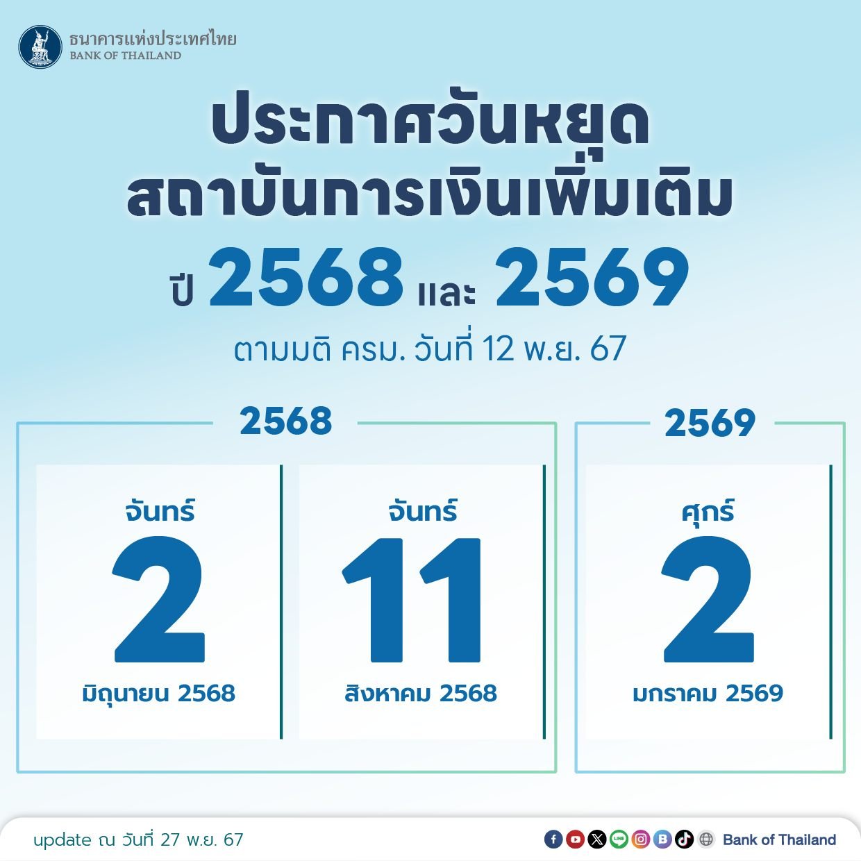 ธนาคารแห่งประเทศไทยพิจารณาแล้ว เห็นสมควรให้เพิ่มวันหยุดทำการของสถาบันการเงิน และสถาบันการเงินเฉพาะกิจเป็นกรณีพิเศษ ประจำปี 2568 จำนวน 2 วัน ได้แก่ วันที่ 2 มิถุนายน 2568 และวันที่ 11 สิงหาคม 2568 และประจำปี 2569 จำนวน 1 วัน ได้แก่ วันที่ 2 มกราคม 2569 เพื่อให้สอดคล้องกับนโยบายของรัฐบาล
