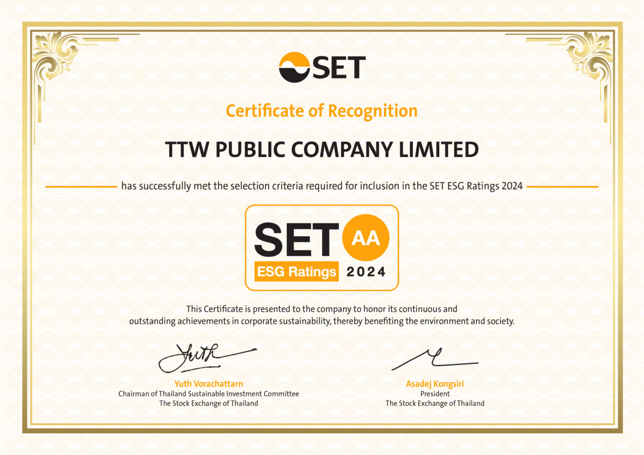 บริษัท ทีทีดับบลิว จำกัด (มหาชน) หรือ TTW ได้รับการประเมินหุ้นยั่งยืน “SET ESG Rating” ในระดับ AA ประจำปี 2567 จากตลาดหลักทรัพย์แห่งประเทศไทย โดยเป็น 1 ใน 228 บริษัทจดทะเบียนที่ได้รับการประกาศผลประเมินหุ้นยั่งยืน SET ESG Ratings แสดงให้เห็นถึงพัฒนาการที่สำคัญในการเปิดเผยข้อมูลด้าน ESG เช่น ข้อมูลการจัดการความเสี่ยงด้าน ESG นโยบายการจัดการสิ่งแวดล้อม ข้อมูลผลการดำเนินงานด้านการจัดการสิ่งแวดล้อม และการดำเนินงานต่อพนักงาน ชุมชน และสังคมผ่านกระบวนการทางธุรกิจ