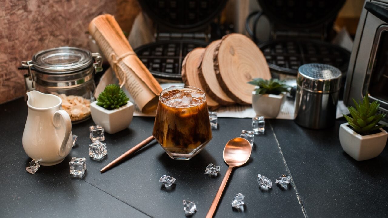 Close-up of iced coffee served on black table at cafe