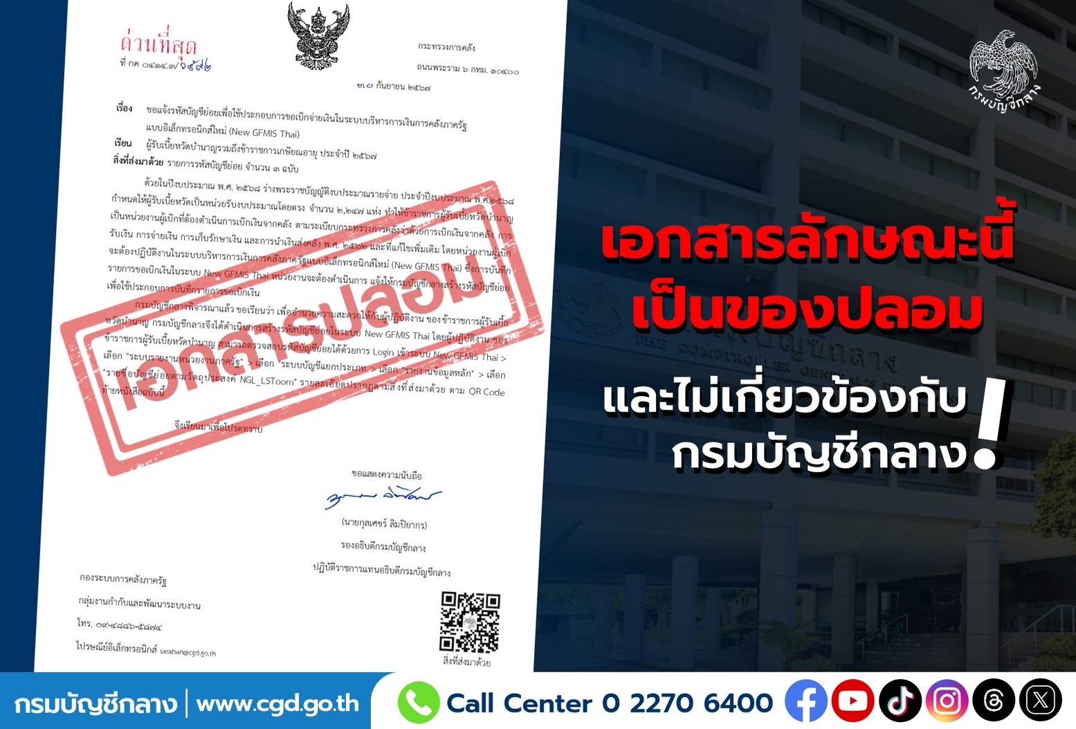กรมบัญชีกลาง แจ้งเตือนมิจฯ ออกหนังสือปลอมแอบอ้างชื่อแจ้งข้าราชการเกษียณ รับเบี้ยบำนาญ ห้ามสแกนเด็ดขาด