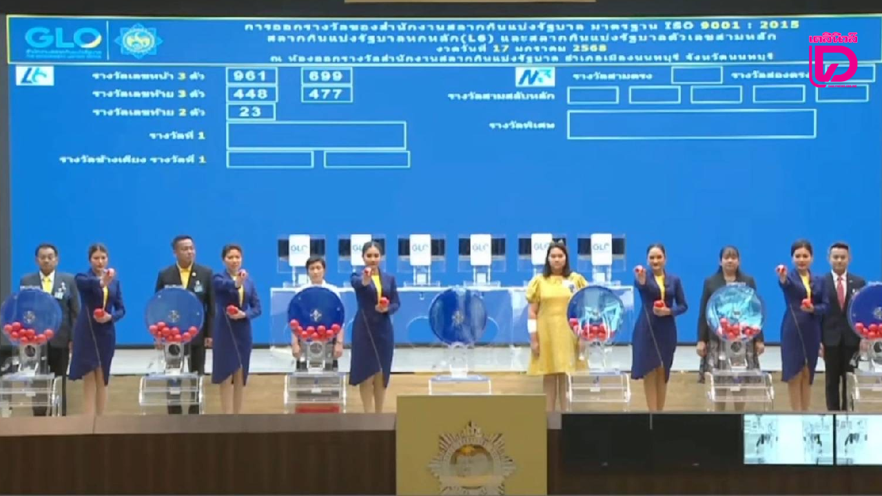 ขณะที่ผลการออกรางวัลงวดนี้ เลขหน้า 3 ตัว ได้แก่ 961 และ 699 รางวัลเลขท้าย 3 ตัว ได้แก่ 448 และ 477 รางวัลเลขท้าย 2 ตัว ออก 23 และรางวัลที่1 ออก 807779 ส่วนงวดหน้า ออกรางวัลที่สำนักงานสลากกินแบ่งรัฐบาลสนามบินน้ำ จ.นนทบุรี วันที่ 1 ก.พ. 68
