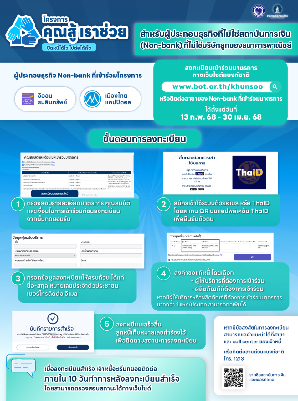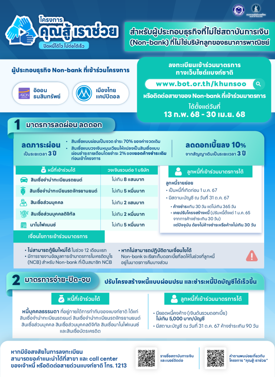 โครงการ “คุณสู้ เราช่วย” มีการขยายครอบคลุมลูกหนี้นอนแบงก์ ลูกหนี้ที่เข้าเงื่อนไข “คุณสู้ เราช่วย” สามารถลงทะเบียนเข้าร่วมมาตรการ ผ่านทางเว็บไซต์ธนาคารแห่งประเทศไทย www.bot.or.th/khunsoo ลูกหนี้นอนแบงก์เข้าร่วมได้เริ่มตั้งแต่วันที่ 13 กุมภาพันธ์ ถึงวันที่ 30 เมษายน 2568