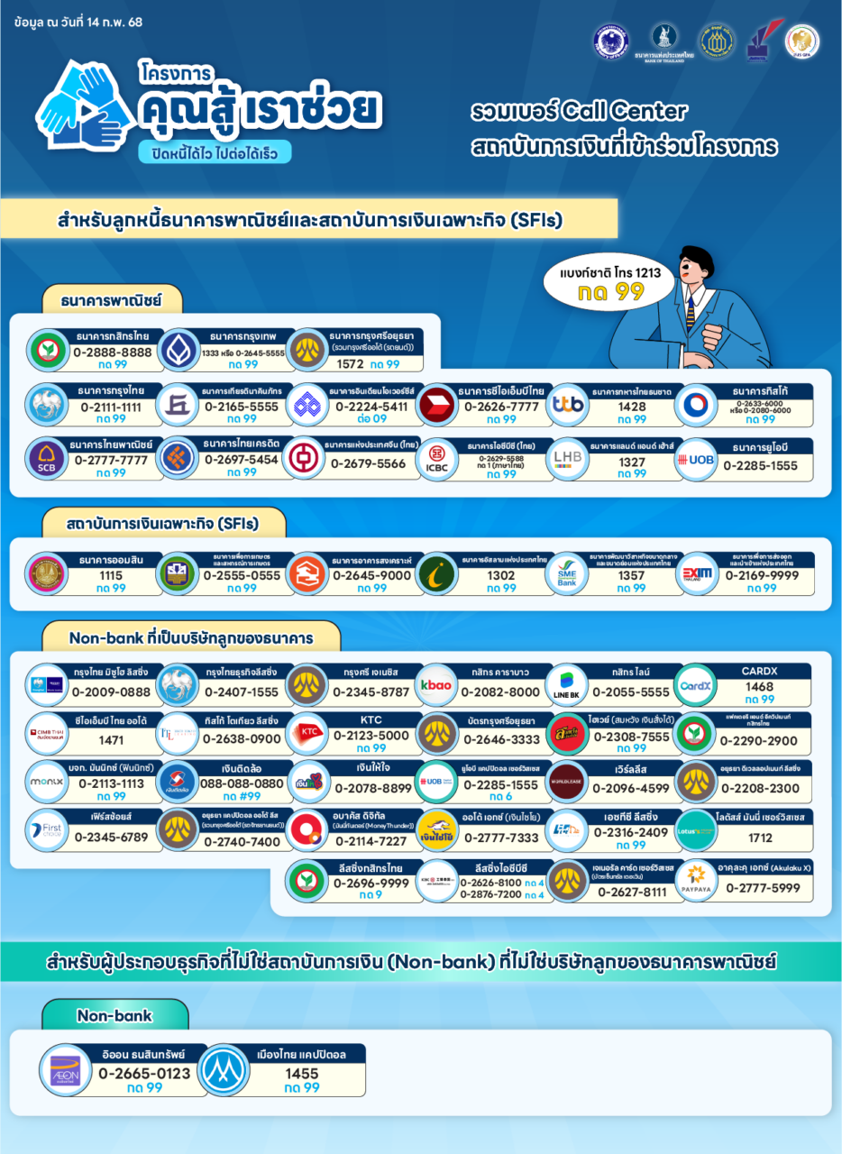 รวมเบอร์โทรฯ Call Center สถาบันการเงิน ธนาคาร นอนแบงก์ที่เข้าร่วมโครงการ