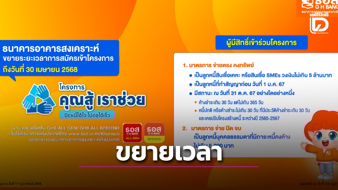 ธอส. ขยายเวลาลงทะเบียน “โครงการคุณสู้ เราช่วย” ถึงวันที่ 30 เมษายน 2568 ผ่าน 3 ช่องทาง เช็กเงื่อนไขรับสิทธิ