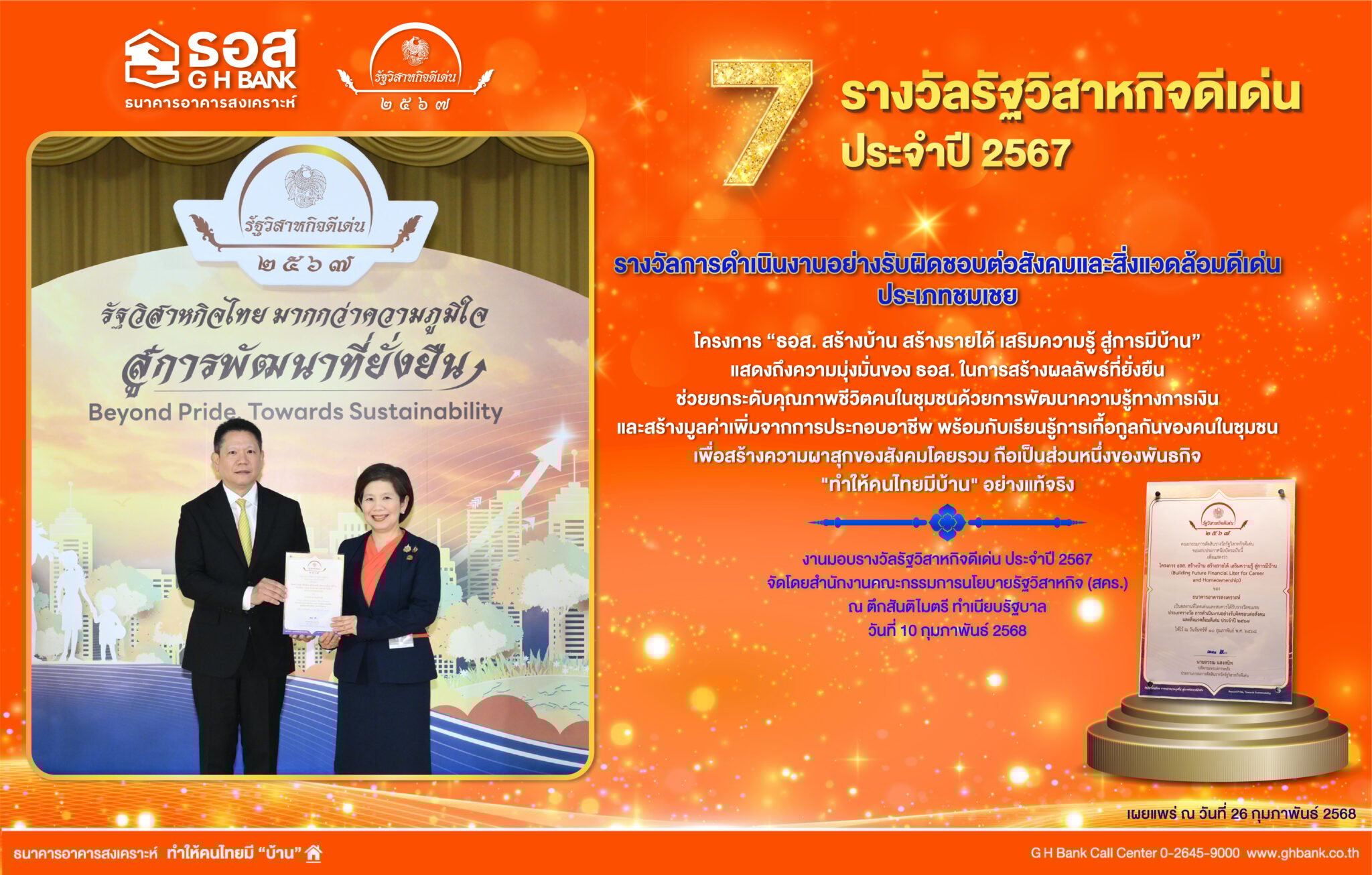 ธนาคารอาคารสงเคราะห์ (ธอส.) โดยนางสาวธิดาพร มีกิ่งทอง รองกรรมการผู้จัดการ กลุ่มงานปฏิบัติการ และรักษาการผู้ช่วยกรรมการผู้จัดการ สายงานสื่อสารและภาพลักษณ์องค์กร รับรางวัลการดำเนินงานอย่างรับผิดชอบต่อสังคมและสิ่งแวดล้อมดีเด่น ประเภทชมเชย จากนายพิชัย ชุณหวชิร รองนายกรัฐมนตรีและรัฐมนตรีว่าการกระทรวงการคลัง ประธานมอบรางวัลรัฐวิสาหกิจดีเด่น ประจำปี 2567 ซึ่ง ธอส. ได้รับรางวัลดังกล่าวจากโครงการ ธอส. สร้างบ้าน สร้างรายได้ เสริมความรู้ สู่การมีบ้าน (Building Futures: Financial Literacy for Career and Homeownership) ซึ่งเป็นโครงการด้านสังคมและสิ่งแวดล้อมที่มุ่งสร้างผลลัพธ์