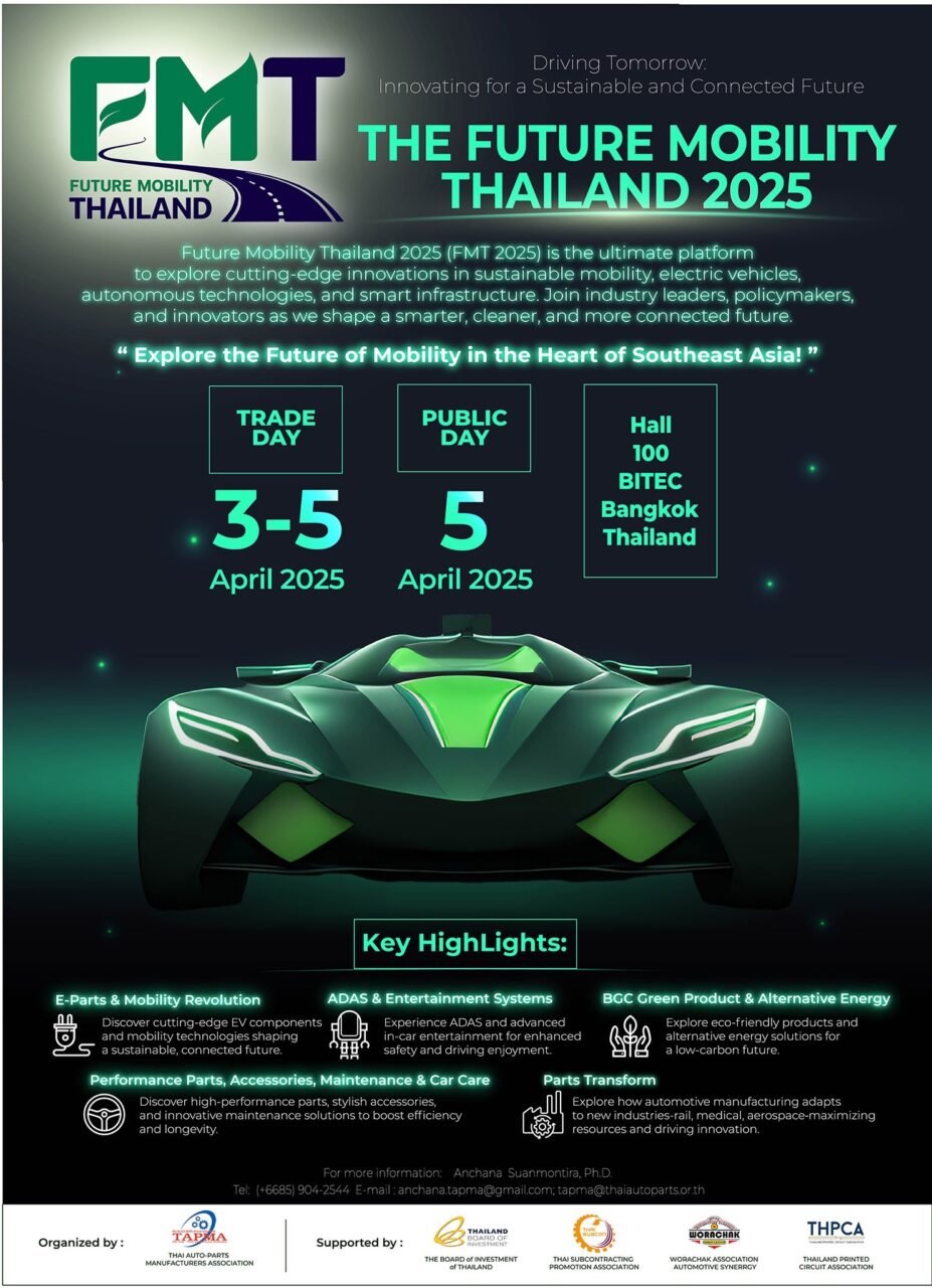 สำหรับปีนี้ สมาคมฯจึงได้จัดงาน Future Mobility Thailand 2025 ระหว่างวันที่ 3 – 5 เมษายน 2568 ณ ศูนย์นิทรรศการและการประชุมไบเทค บางนา ถือเป็นก้าวสำคัญของอุตสาหกรรมชิ้นส่วนยานยนต์ไทยที่พร้อมก้าวไปกับเทคโนโลยีสมัยใหม่ เช่นยานยนต์ไฟฟ้า (EV),ยานยนต์ไฮบริด (HEV,PHEV),ระบบขับขี่อัตโนมัติ (Autonomous Vehicles) รวมถึงเทคโนโลยีเชื่อมต่ออัจฉริยะ (Connected Vehicles)