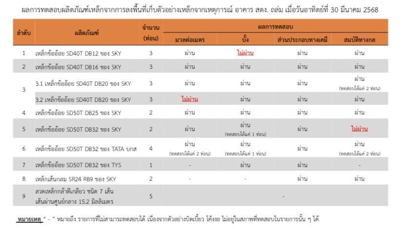 นายพงศ์พล กล่าวเพิ่มเติมว่า ที่ผ่านมาผลการทดสอบเหล็กเส้น sky ของบริษัท ซินเคอหยวน สตีล จากตึก สตง. เมื่อวันที่ 3 เม.ย. 68 โดยสถาบันเหล็กฯ มีผลเป็นไปตามข่าวก่อนหน้านี้คือ มีเหล็ก 3 ชนิดที่ตกค่ามาตรฐาน มอก. ได้แก่ 1. เหล็กข้ออ้อย 12 มิลลิเมตร ตกทดสอบความสูงของบั้ง (การยึดเกาะกับปูน) 2. เหล็กข้ออ้อย 20 มิลลิเมตร ตกทดสอบค่าเหล็กเบา (มวลต่อเมตร) 3. เหล็กข้ออ้อย 32 มิลลิเมตร ตกทดสอบค่าแรงดึง (การรับแรง)