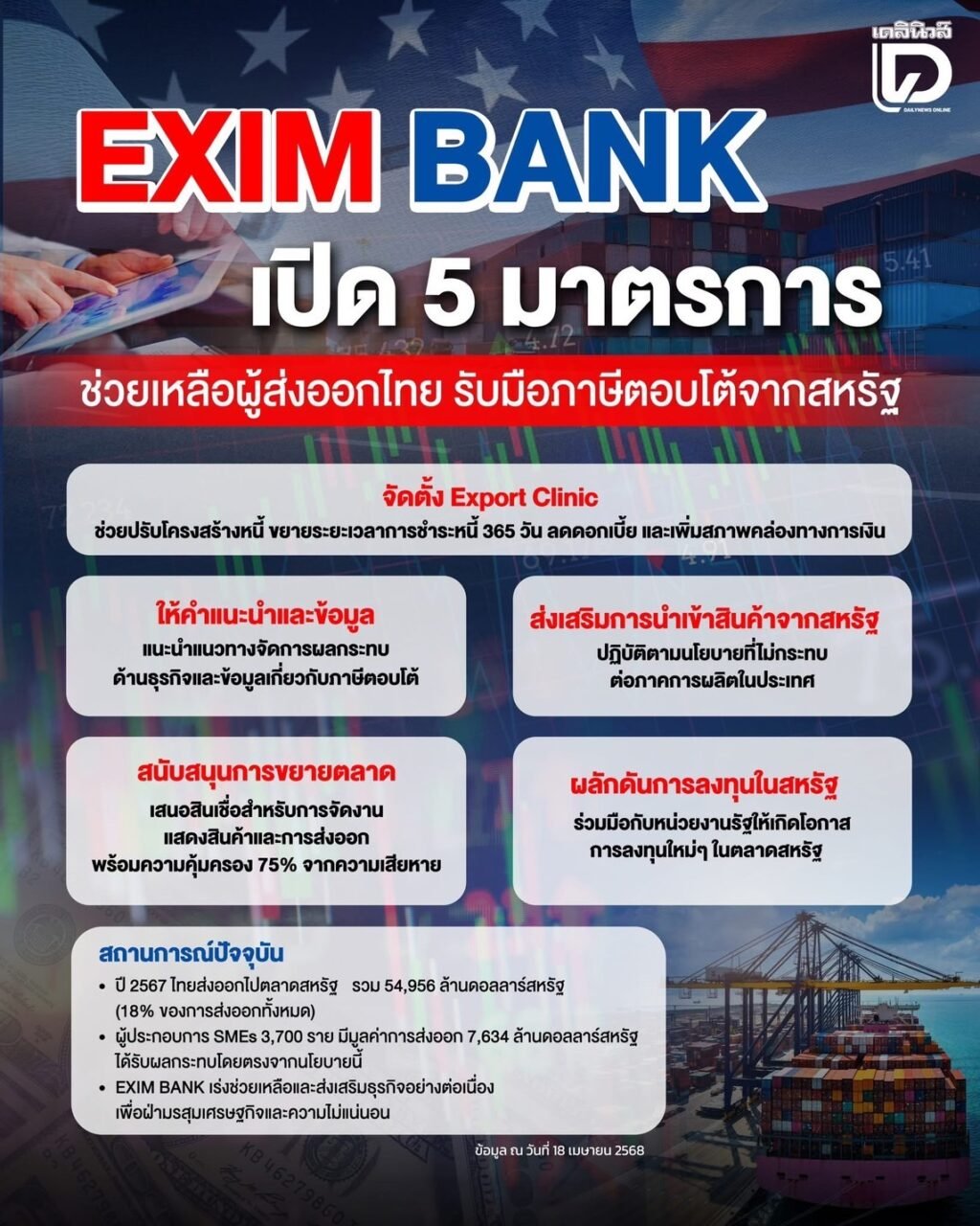 EXIM BANK ออก 5 มาตรการช่วยเหลือผู้ส่งออกไทย รับมือภาษีตอบโต้จากสหรัฐ