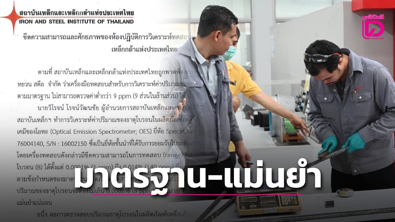 อนึ่ง ผลการตรวจสอบปริมาณธาตุโบรอนในผลิตภัณฑ์เหล็กเส้นเสริมคอนกรีต: เหล็กข้ออ้อยของบริษัท ซินเคอหยวน สตีล จำกัด ลงวันที่ 23 ธันวาคม 2567 พบว่าเหล็กข้ออ้อย ขนาด DB32 ชั้นคุณภาพ SD50 มีปริมาณธาตุโบรอน 10 ppm ซึ่งเกินค่ามาตรฐาน และเหล็กข้ออ้อย ขนาด DB25 ชั้นคุณภาพ SD40 มีปริมาณธาตุโบรอน 12 ppm ซึ่งเกินค่ามาตรฐาน ดังนั้นการอ้างว่าเครื่องทดสอบที่สถาบันเหล็กๆ ได้ขึ้นทะเบียนตามมาตรฐาน ISO/IEC 17025 กับสำนักงานมาตรฐานผลิตภัณฑ์อุตสาหกรรม เป็นเครื่องทดสอบที่ไม่สามารถตรวจได้อย่างแม่นยำนั้นไม่เป็นความจริง อีกทั้งผลการตรวจสอบ ปริมาณธาตุโบรอนที่เกินมาตรฐานที่ 10-12 ppm ก็อยู่ในช่วงการวัดที่เครื่องทดสอบทำงานได้อย่างแม่นยำ โดยไม่มีข้อถกเถียง