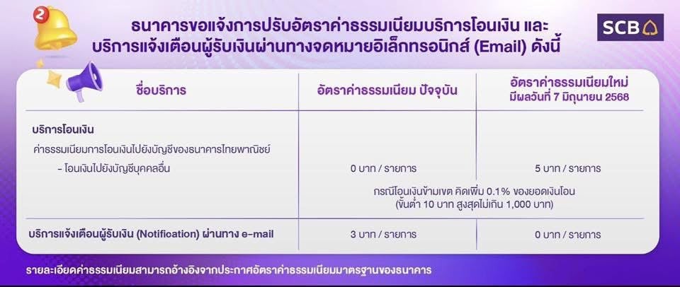 ธนาคารไทยพาณิชย์ (SCB) แจ้งประกาศเก็บค่าธรรมเนียมการโอนเงินบัญชีบุคคลอื่น 5 บาทต่อรายการ มีผลตั้งแต่ 7 มิ.ย. 68 เป็นต้นไป