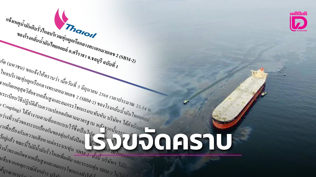 บริษัท ไทยออยล์ จำกัด (มหาชน) ออกหนังสือ แจงเหตุน้ำมันดิบรั่วไหลในทะเลชลบุรี ยันควบคุมสถานการณ์ได้แล้ว ระบุเกิดจากคลื่นสูง ลมกระโชกแรง พร้อมแสดงความรับผิดชอบ เร่งขจัดคราบน้ำมันตามแผนปฏิบัติการ
