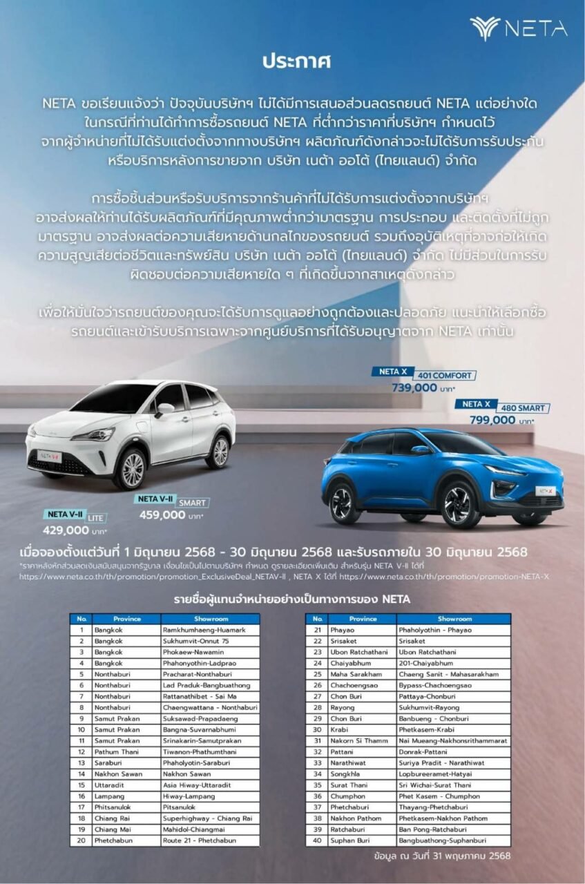 NETA ขอเรียนแจ้งว่า ปัจจุบันบริษัทฯ ไม่ได้มีการเสนอส่วนลดรถยนต์ NETA แต่อย่างใด ในกรณีที่ท่านได้ทำการซื้อรถยนต์ NETA ที่ต่ำกว่าราคาที่บริษัทฯ กำหนดไว้ จากผู้จำหน่ายที่ไม่ได้รับแต่งตั้งจากทางบริษัทฯ ผลิตภัณฑ์ดังกล่าว จะไม่ได้รับการรับประกันหรือบริการหลังการขายจาก บริษัท เนต้า ออโต้ (ไทยแลนด์) จำกัด