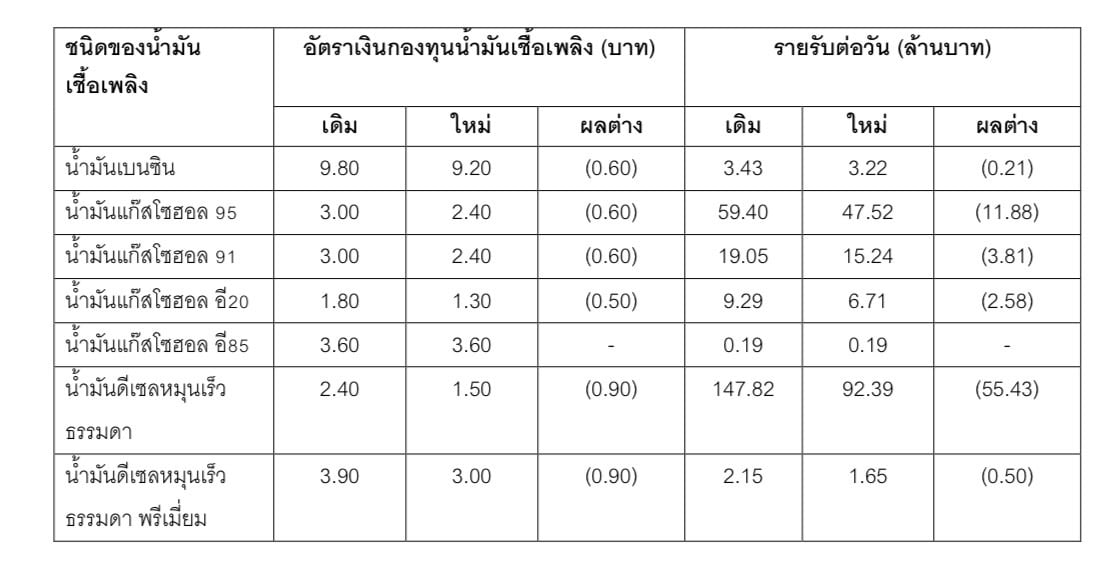 อย่างไรก็ตามการปรับลดอัตราเงินส่งเข้ากองทุนน้ำมันฯดังกล่าว จะทำให้รายรับของกองทุนน้ำมันเชื้อเพลิงประเภทน้ำมันทุกชนิด รวมถึงน้ำมันเตา ลดลงประมาณวันละ 74.41 ล้านบาท จากเดิมที่มีรายรับประมาณวันละ 241.64 ล้านบาท เหลือประมาณวันละ 167.23 ล้านบาท โดยปัจจุบันฐานะกองทุนน้ำมันเชื้อเพลิง ณ วันที่ 15 มิ.ย. 68 ติดลบอยู่ที่ 36,268 ล้านบาท แบ่งเป็น บัญชีน้ำมันบวกอยู่ที่ 8,244 ล้านบาท และบัญชีแอลพีจี ติดลบอยู่ที่ 44,512 ล้านบาท