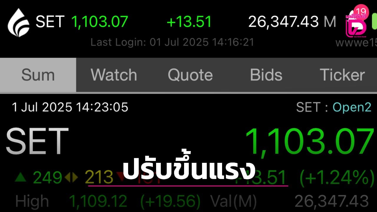 รายงานข่าวจาก ตลาดหลักทรัพย์แห่งประเทศไทย (ตลท.) เปิดเผยว่า บรรยากาศหุ้นไทย ณ ช่วงเวลา 14.15 น. ปรับตัวเพิ่มขึ้นไปสูงสุด 19.56 จุด ที่ดัชนี 1,109.02 จุด หลังจากเปิดตลาดซื้อขายช่วงภาคบ่ายตั้งแต่เวลา 14.00 น.ไปไม่นาน โดยตอบรับข่าว ศาลรัฐธรรมนูญ มีมติเอกฉันท์รับคำร้องคดี สว. ร้องถอดถอน “น.ส.แพทองธาร ชินวัตร” นายกรัฐมนตรี ปมคลิปเสียงสนทนา “ฮุน เซน” และมีมติ 7 ต่อ 2 สั่งหยุดปฏิบัติหน้าที่นายกรัฐมนตรีตั้งแต่วันนี้