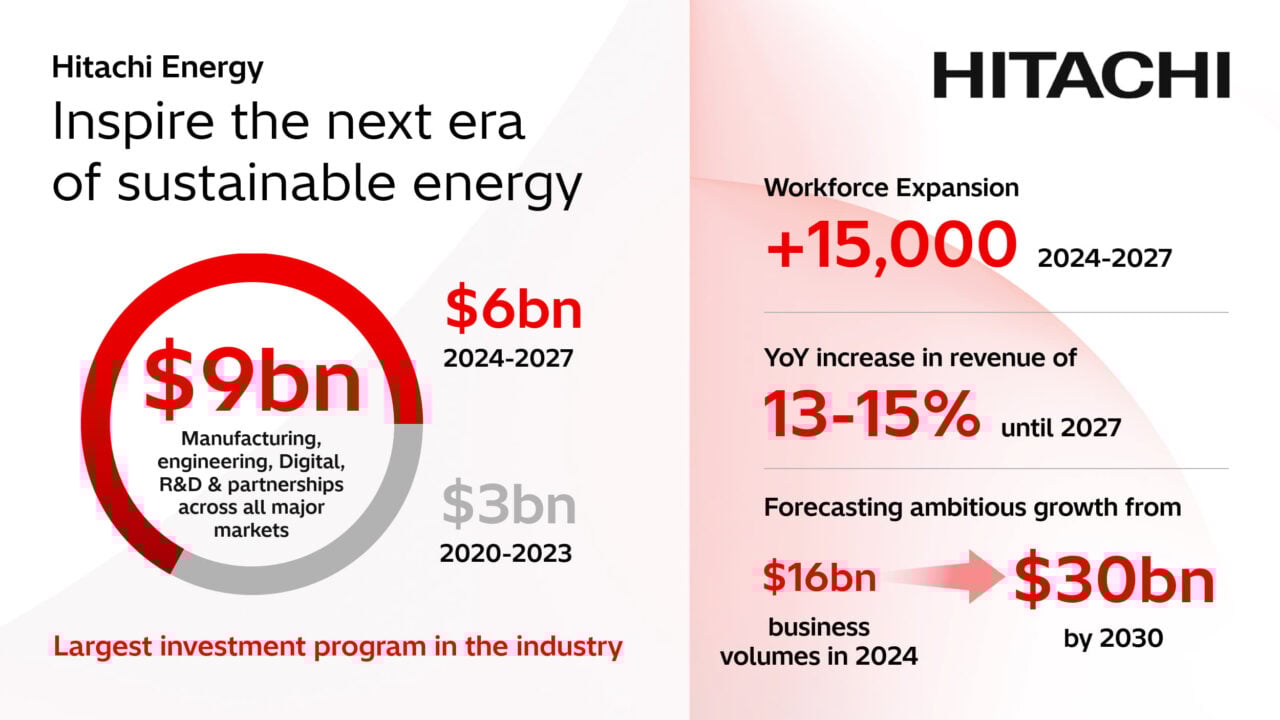 นายวรวุฒิ วรุตตมพรสุ Country Managing Director บริษัท ฮิตาชิ เอนเนอร์ยี่ (ประเทศไทย) จำกัด เปิดเผยว่า ในประเทศไทย Hitachi Energy ยังคงลงทุนอย่างต่อเนื่องในการขยายโรงงาน,เพิ่มจำนวนบุคลากร และพัฒนาบุคลากรท้องถิ่นให้มีศักยภาพ โดยล่าสุดปี67 ที่ผ่านมาลงทุนสร้างโรงงานที่นิคมอุตสาหกรรมบางปู และเริ่มเปิดดำเนินการในปี68 นี้เป็นต้นไป ซึ่งเป็นหนึ่งในแผนงานของบริษัทแม่ที่จะใช้เงินทุนทั่วโลก 6,000 ล้านเหรียญสหรัฐ พร้อมกับเพิ่มบุคลากรอีก 15,000 คน ใน 3 ปี (67-69)