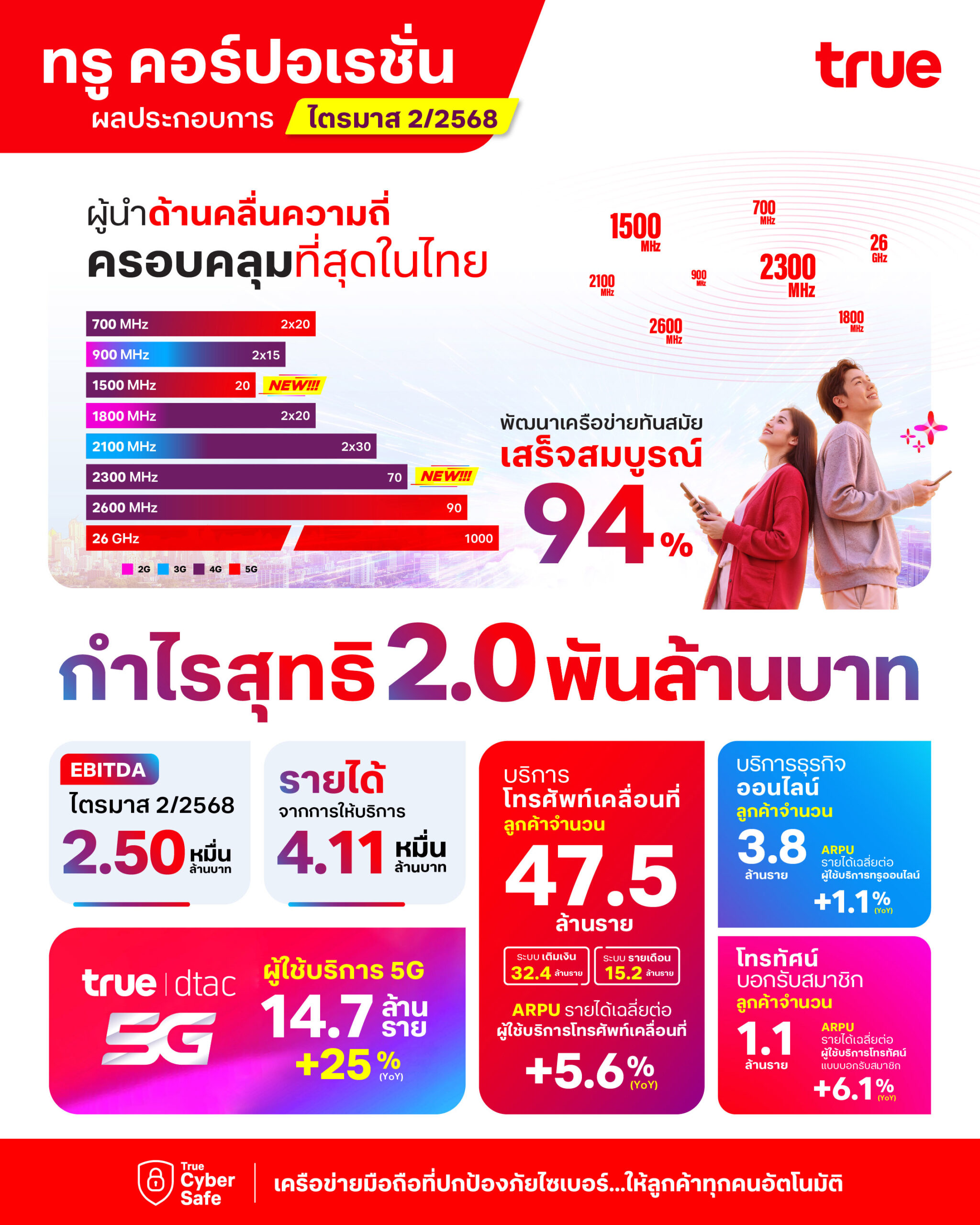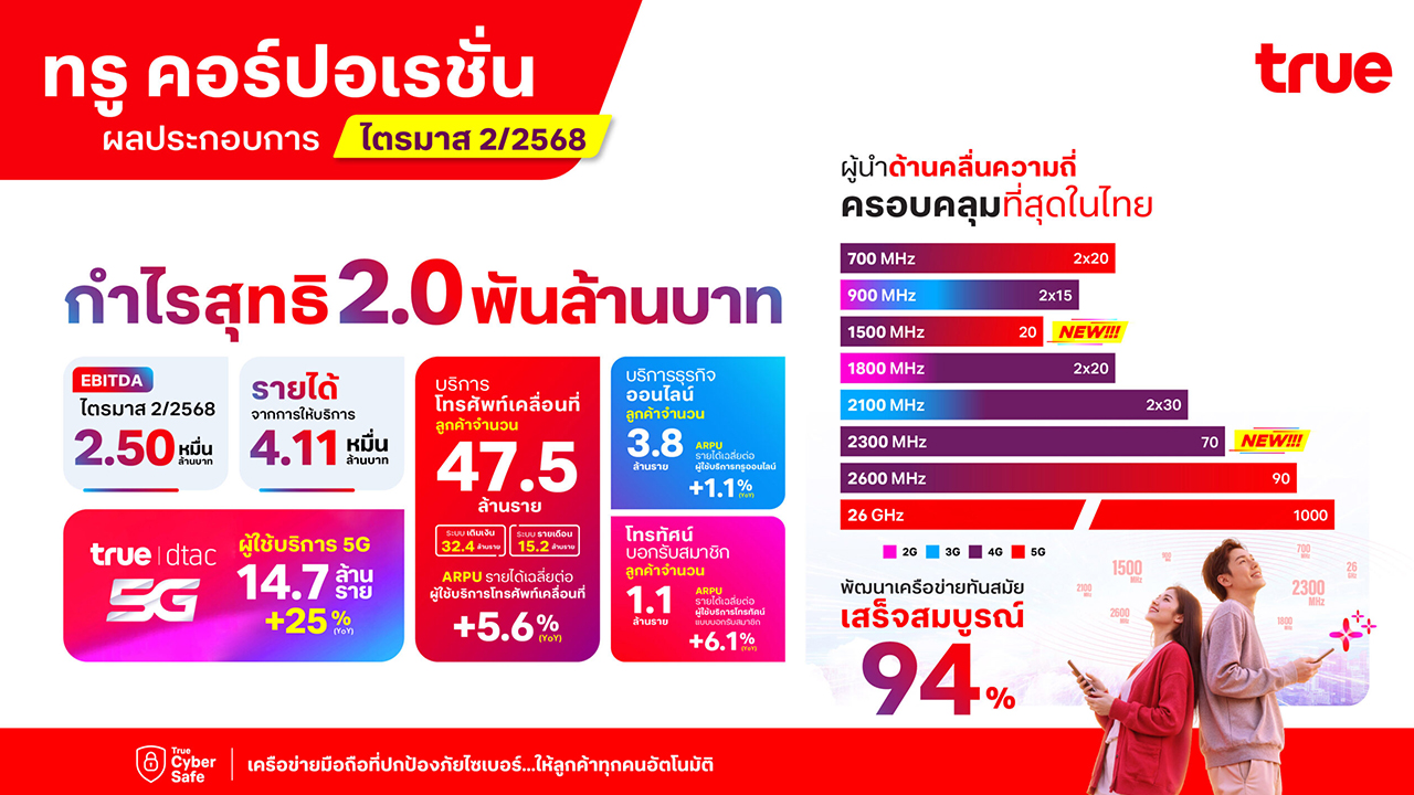 ทรู โชว์ผลงานไตรมาส 2/2568 มีกำไรสุทธิ 2.0 พันล้านบาท ทำกำไรต่อเนื่องเป็นไตรมาสที่ 2 ติดต่อกัน