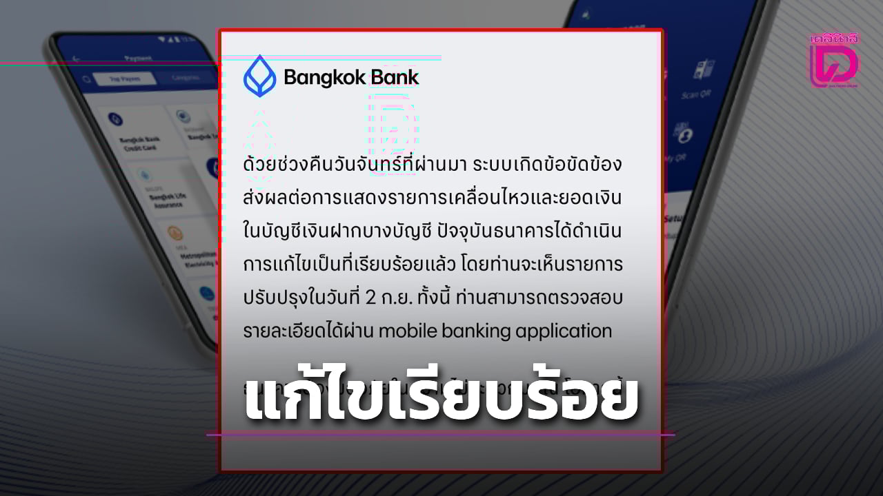 ธนาคารกรุงเทพ ประกาศแจ้งแก้ไขเรียบร้อย เหตุโมบายแบงก์กิ้ง แอปพลิเคชันขัดข้อง ยอดเงินในบัญชีแสดงไม่ครบ