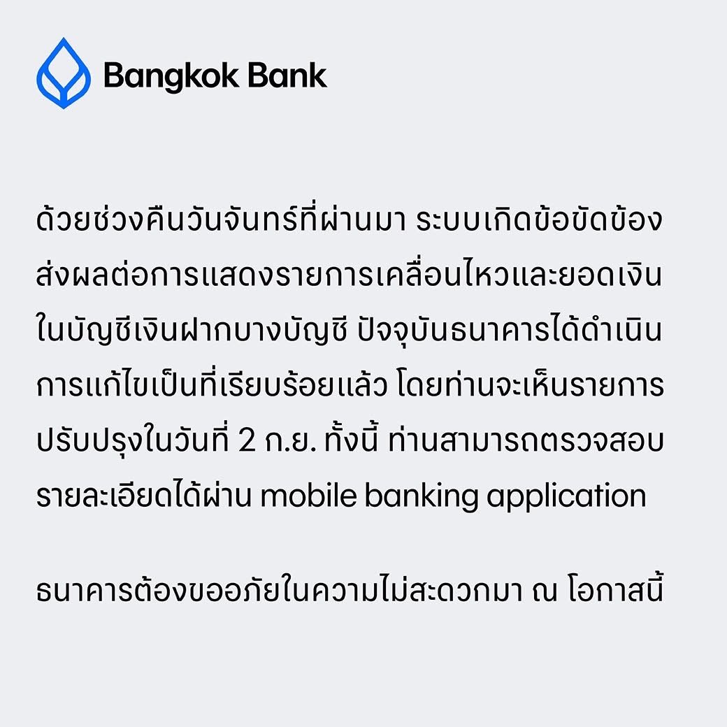 วันที่ 3 ก.ย. ธนาคารกรุงเทพ ชี้แจงว่า “ด้วยช่วงคืนวันจันทร์ที่ผ่านมา ระบบเกิดข้อขัดข้อง ส่งผลต่อการแสดงรายการเคลื่อนไหวและยอดเงินในบัญชีเงินฝากบางบัญชี