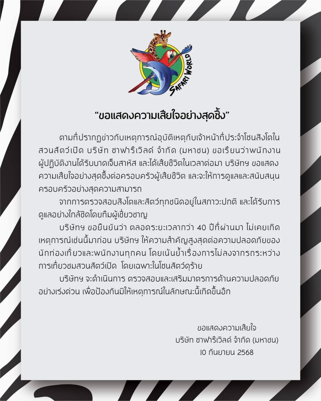 ซาฟารีเวิลด์ ออกแถลงการณ์ เรื่องพนักงานเสียชีวิต ย้ำเสียใจอย่างสุดซึ้ง