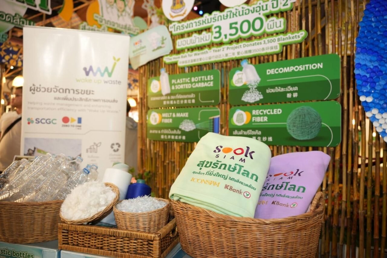 ขณะเดียวกัน ยังเพิ่มจำนวนการผลิตผ้าห่มรักษ์โลกเป็น 3,500 ผืน เพื่อส่งมอบให้กับเด็กเล็กในโรงเรียนจังหวัดทางภาคเหนือจำนวน 30 โรงเรียน นอกจากนี้ยังส่งเสริมให้ผู้ประกอบการร้านค้าในเมืองสุขสยาม มีความรับผิดชอบต่อสังคมและสิ่งแวดล้อม ด้วยการใช้ผลิตภัณฑ์ภาชนะรักษ์โลก “Fest Bio Brown” นวัตกรรมบรรจุภัณฑ์อาหารเป็นมิตรกับสิ่งแวดล้อม ที่ร่วมกับธนาคารกสิกรไทย และบริษัท ผลิตภัณฑ์กระดาษไทย จำกัด ใน Fest by SCGP พัฒนาขึ้นจากเยื่อยูคาลิปตัส 100% สามารถย่อยสลายได้เองตามธรรมชาติภายใน 60 วัน อีกทั้งยังส่งต่อขวดพลาสติก กระป๋องน้ำพลาสติก และลังกระดาษให้ Wake Up Waste แพลตฟอร์มซื้อขายขยะรีไซเคิล นำไปเปลี่ยนเป็นผลิตภัณฑ์รักษ์โลกที่สร้างมูลค่าได้