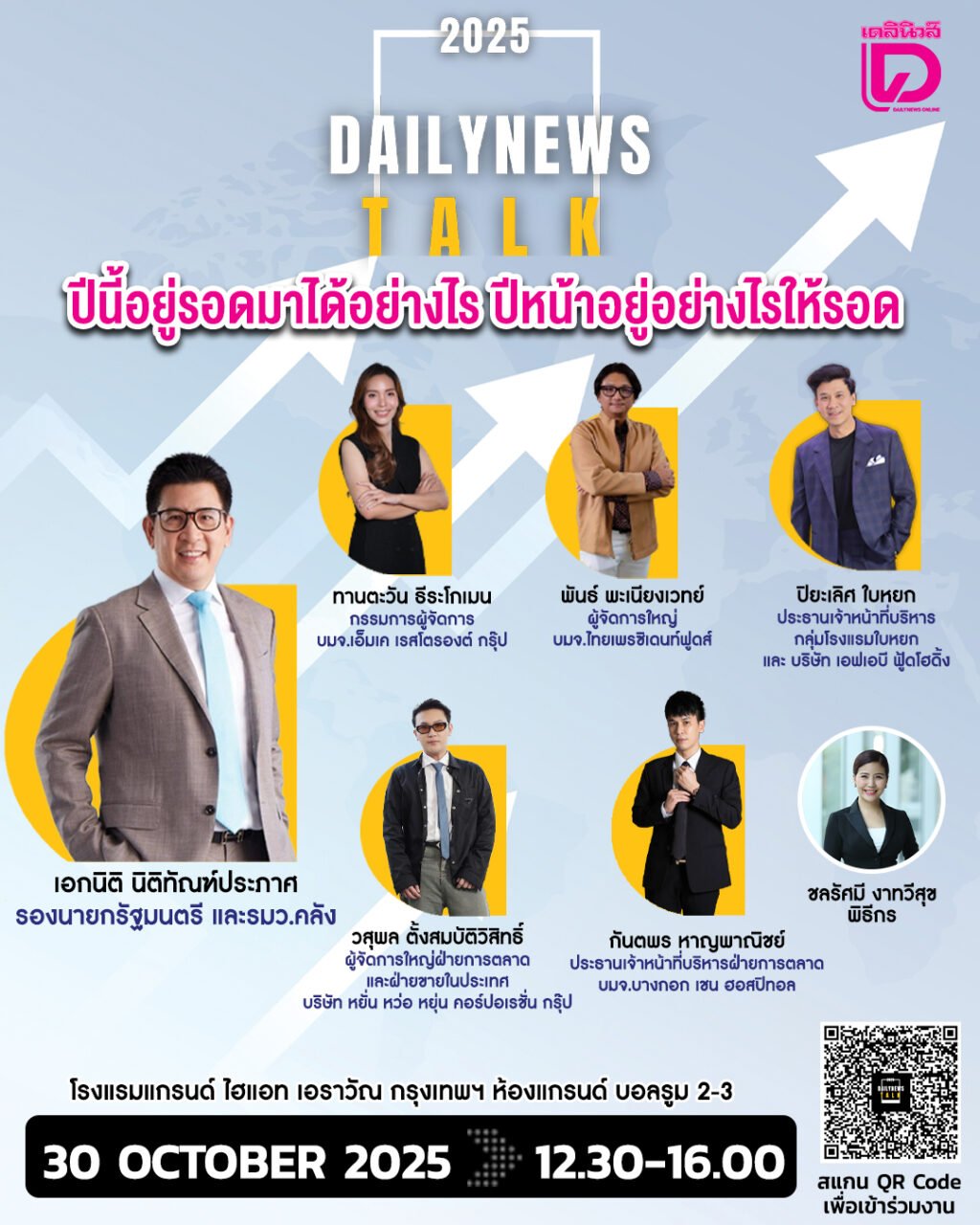 “เดลินิวส์” เตรียมจัดเวทีเสวนา “เดลินิวส์ ทอล์ก 2025” (Dailynews Talk) ภายใต้หัวข้อ “ปีนี้อยู่รอดมาได้อย่างไร ปีหน้าอยู่อย่างไรให้รอด” ในวันพฤหัสบดีที่ 30 ตุลาคม 2568 เวลา 12.30น-16.00 น. ณ ห้อง แกรนด์ บอลรูม 2-3 โรงแรมแกรนด์ไฮแอท เอราวัณ กรุงเทพฯ