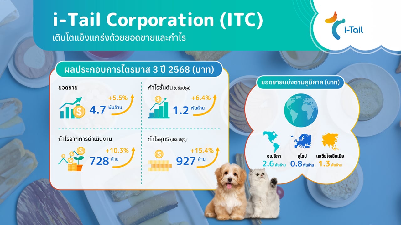 บริษัท ไอ–เทล คอร์ปอเรชั่น จำกัด (มหาชน) (ITC) ผู้นำระดับโลกในอุตสาหกรรมอาหารสัตว์เลี้ยง รายงานผลประกอบการไตรมาส 3 ปี 2568 ด้วยยอดขาย 4,721 ล้านบาท เติบโต 6.4% เมื่อเทียบกับช่วงเดียวกันของปีก่อน และเพิ่มขึ้น 5.5% จากไตรมาสก่อนหน้า โดยมียอดขายในสกุลดอลลาร์สหรัฐเพิ่มขึ้น 14.2% เมื่อเทียบกับปีก่อน อยู่ที่ 144 ล้านดอลลาร์สหรัฐ ซึ่งเป็นผลจากคำสั่งซื้อในตลาดสหรัฐอเมริกาและการขยายตลาดในยุโรป สะท้อนการเติบโตอย่างต่อเนื่องและความเชื่อมั่นจากลูกค้าแบรนด์อาหารสัตว์เลี้ยงชั้นนำ ทั้งนี้ บริษัทมีกำไรขั้นต้นปรับปรุงอยู่ที่ 1,192 ล้านบาท เพิ่มขึ้น 6.4% จากไตรมาสก่อน ขณะที่กำไรสุทธิปรับปรุงอยู่ที่ 927 ล้านบาท เพิ่มขึ้น 15.4% จากไตรมาสก่อนหน้า